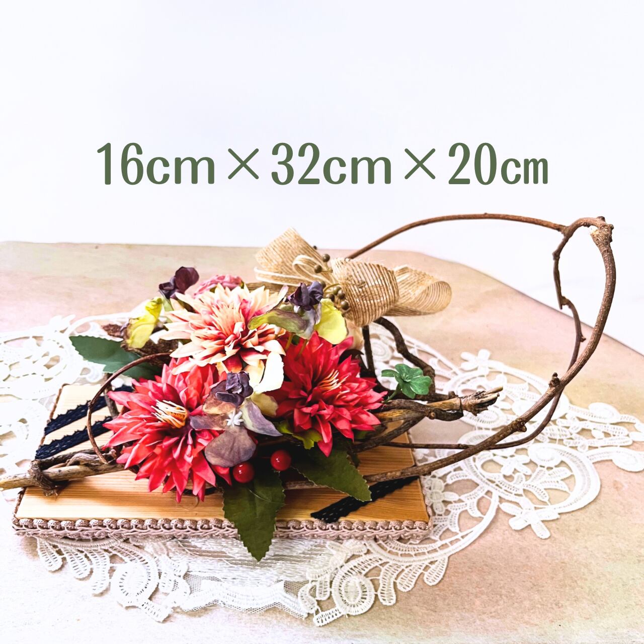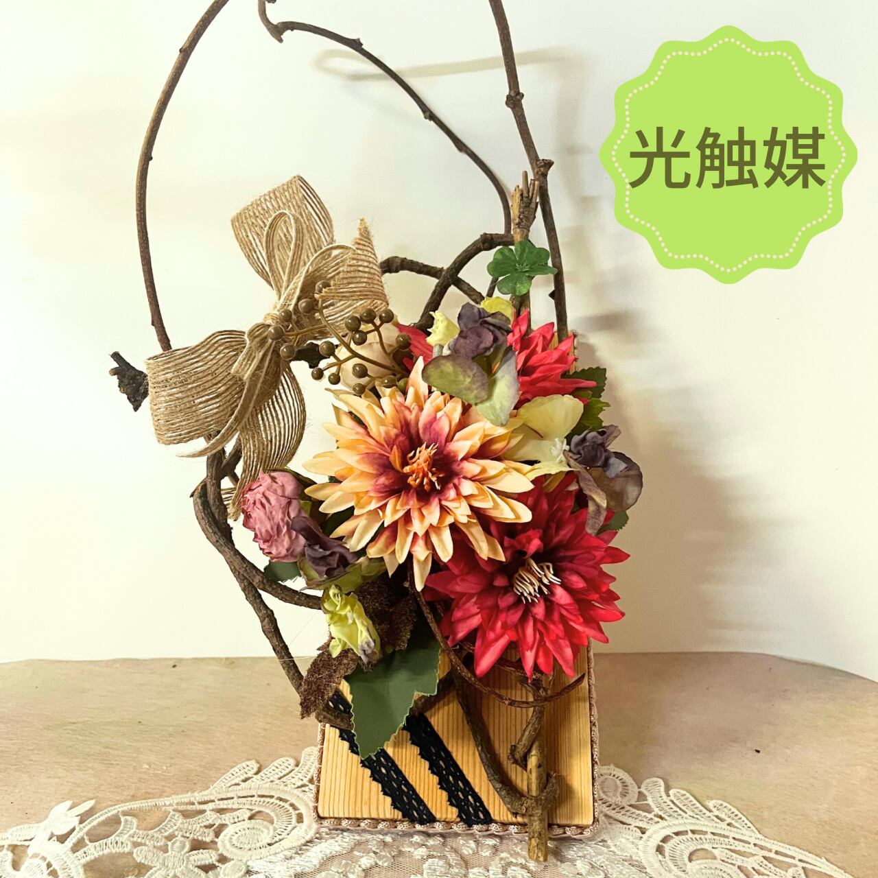 こちらの作品はユニークな形の天然つるとアーティフィシャルF(造花)でアレンジしてみました。