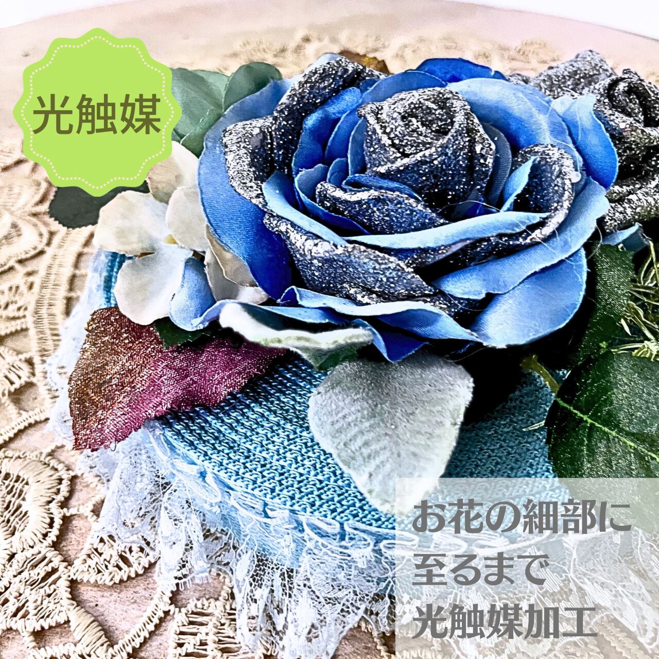 ブルーとラメ薔薇アレンジ(掛けるタイプ)【光触媒加工】