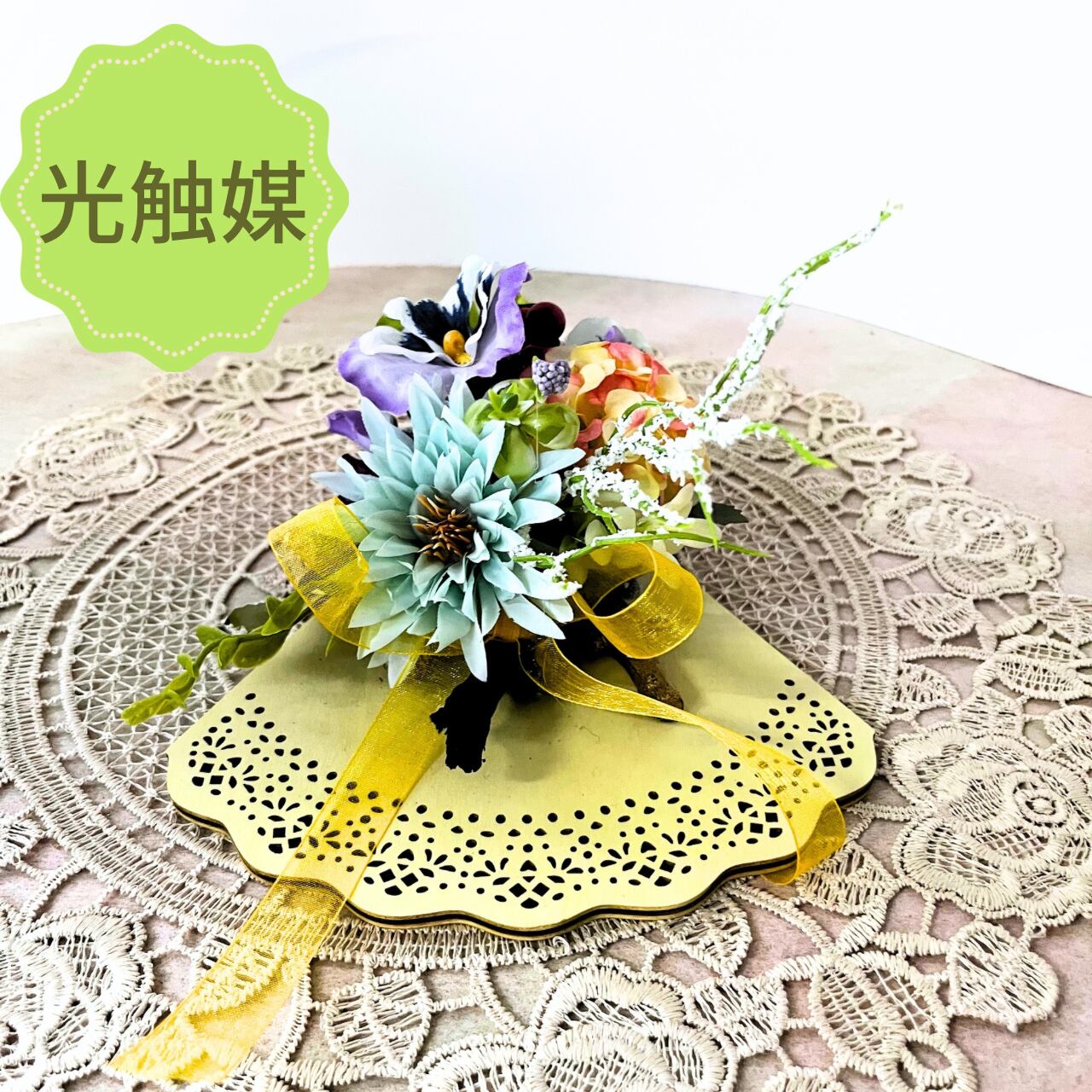こちらは、まるでクレープのような優しいお色と形のイエロー色プレートにアーティフィシャルF(造花)を盛り盛りにアレンジした元気が出そうな作品です。