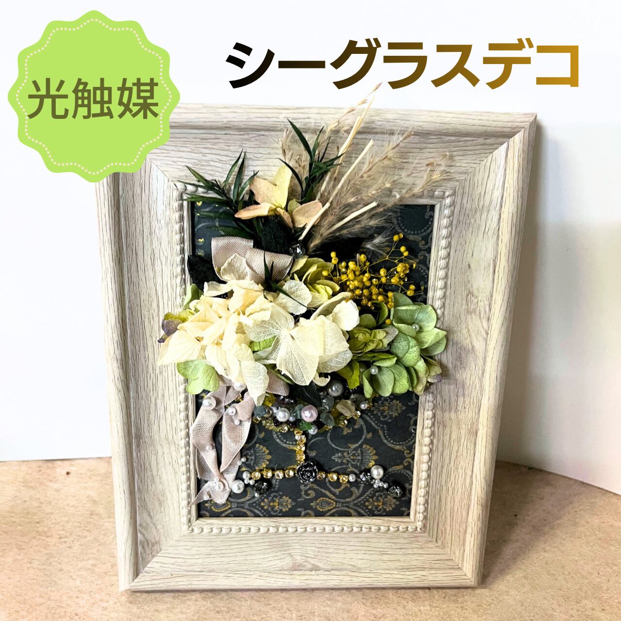こちらの作品は海の宝石の別名を持つシーグラスデコです。