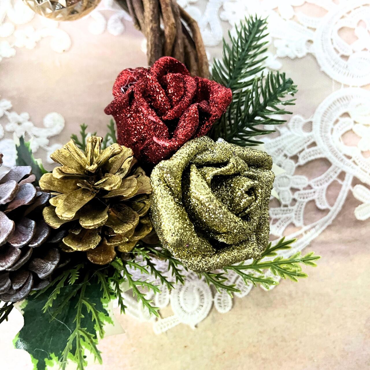 こちらは天然つるの素朴な雰囲気のリースにラメラメの薔薇をアレンジしてみました。