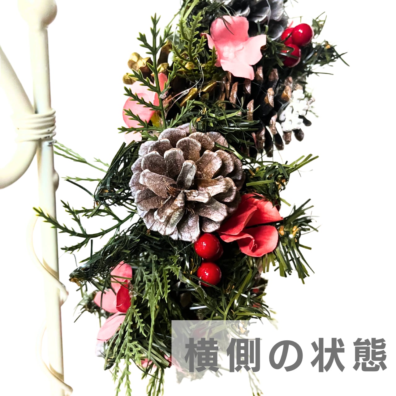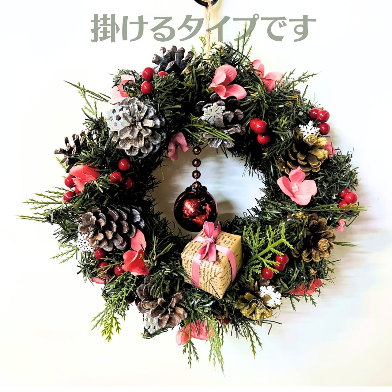 こちらはグリーンリースに可愛らしいお色の小花を添え松ぼっくりでボリュームを出した作品です。