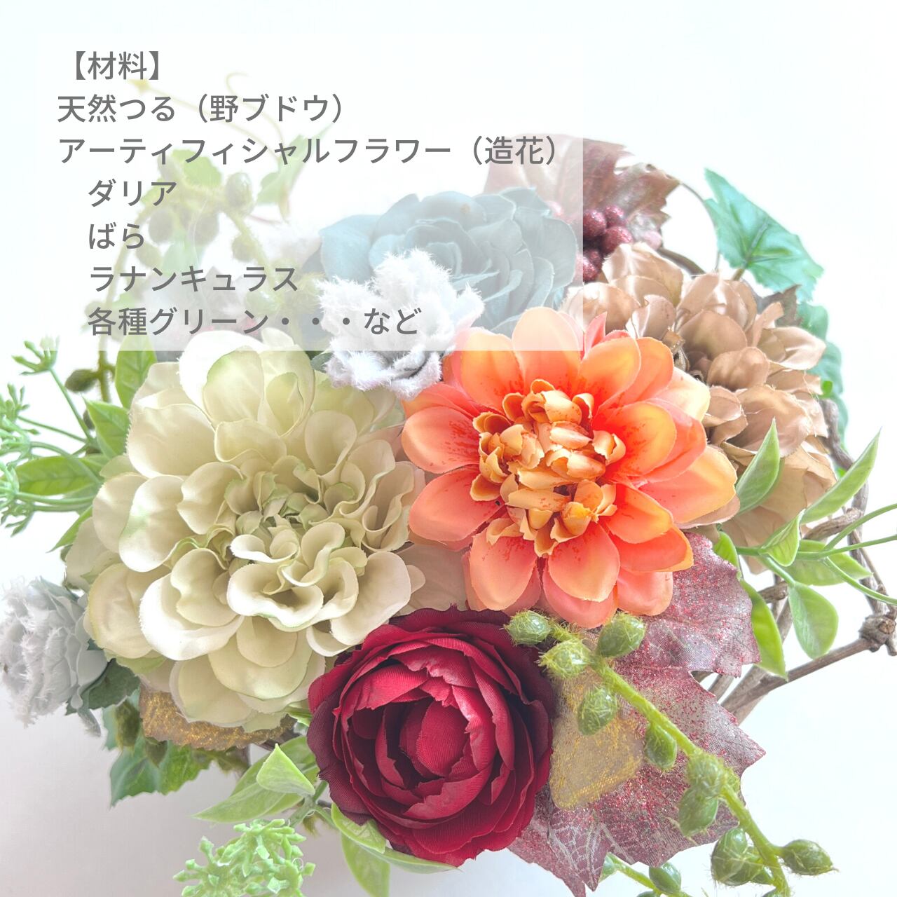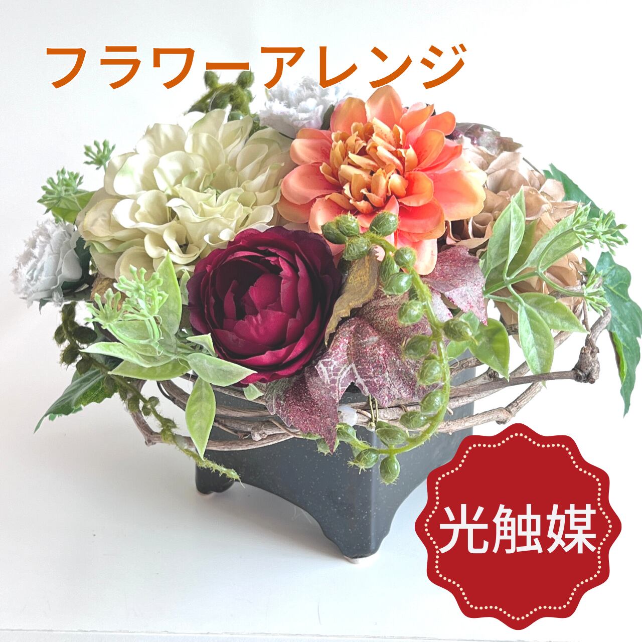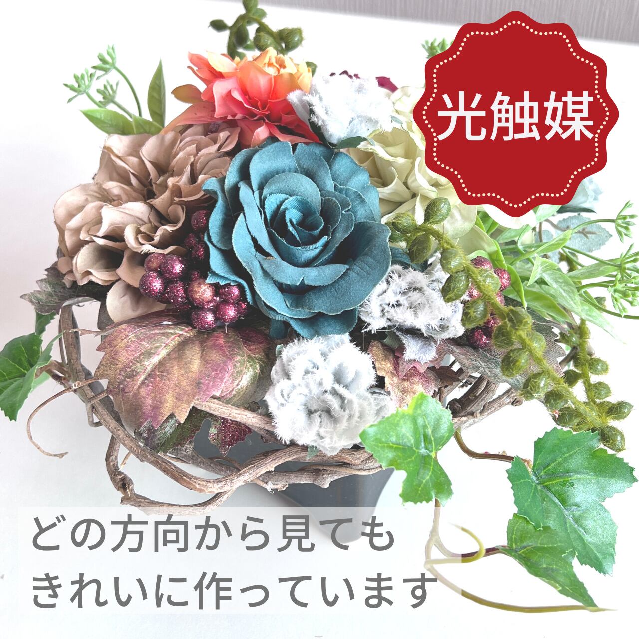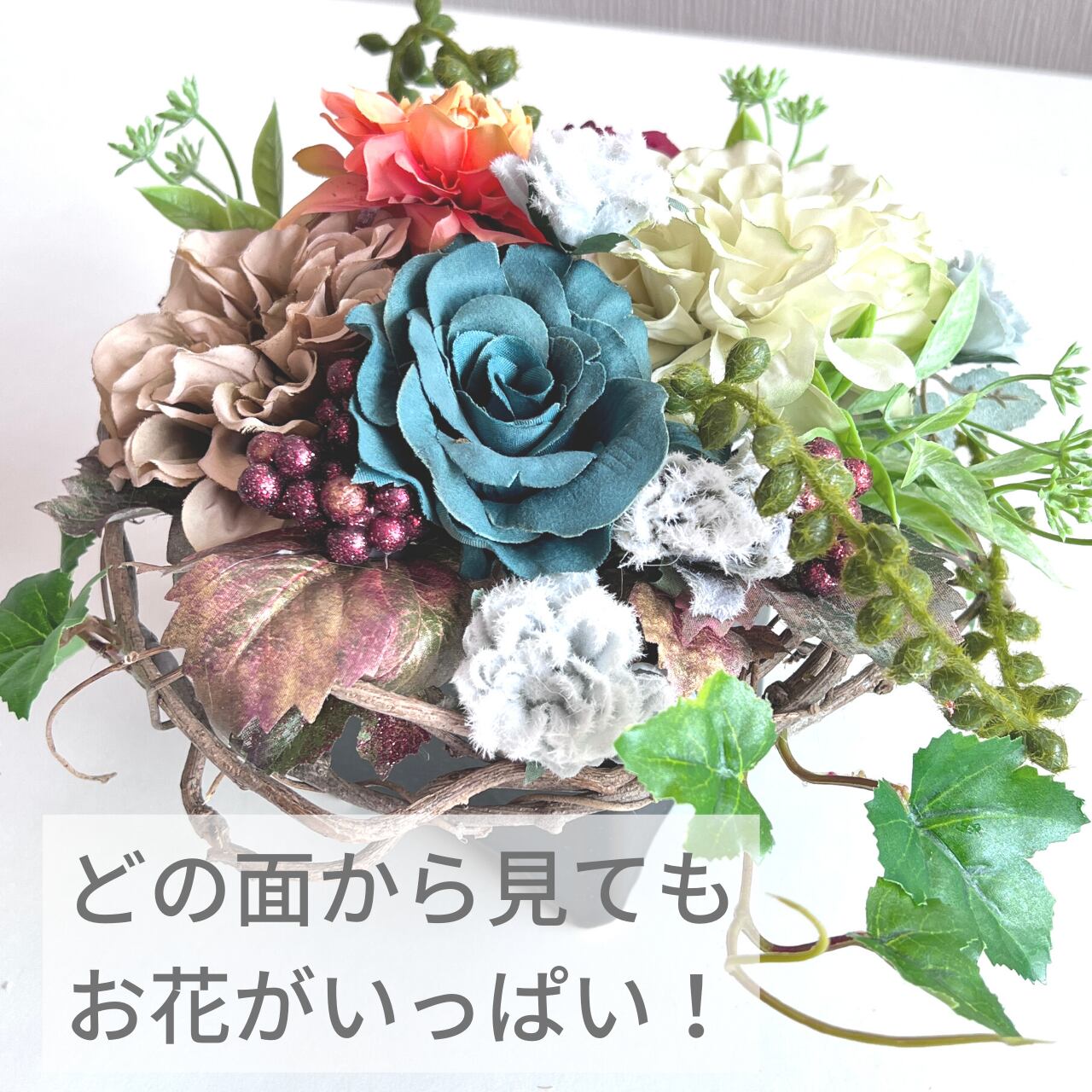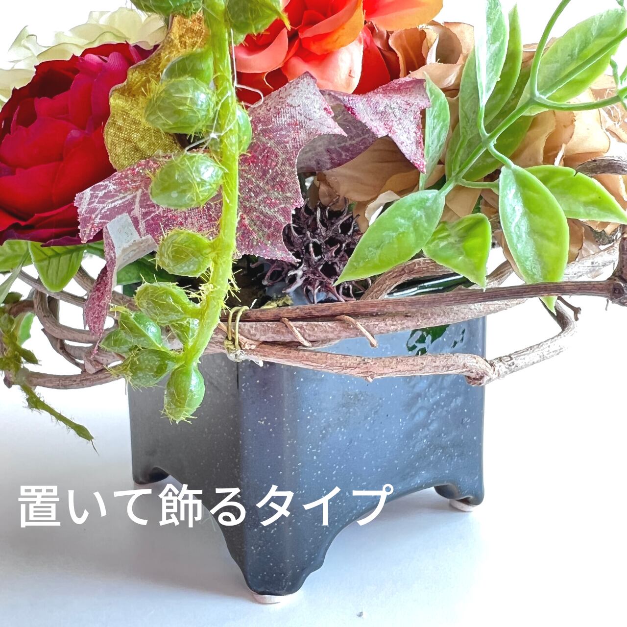 天然つるにアーティフィシャルフラワー(造花)をアレンジした置くタイプのアレンジです。