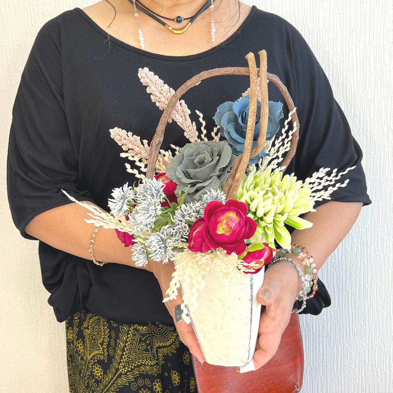 こちらの作品は、ブルーのお色が微妙に違う2本のバラをメインに鮮やかな濃いピンクのラナンキュラス、それを全く邪魔しないくすみピンクのムスカリやアスチルベなどでお作りしています。