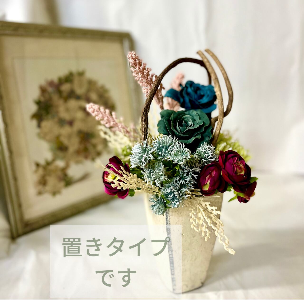 天然つるにアーティフィシャルフラワー(造花)をアレンジした置くタイプです。