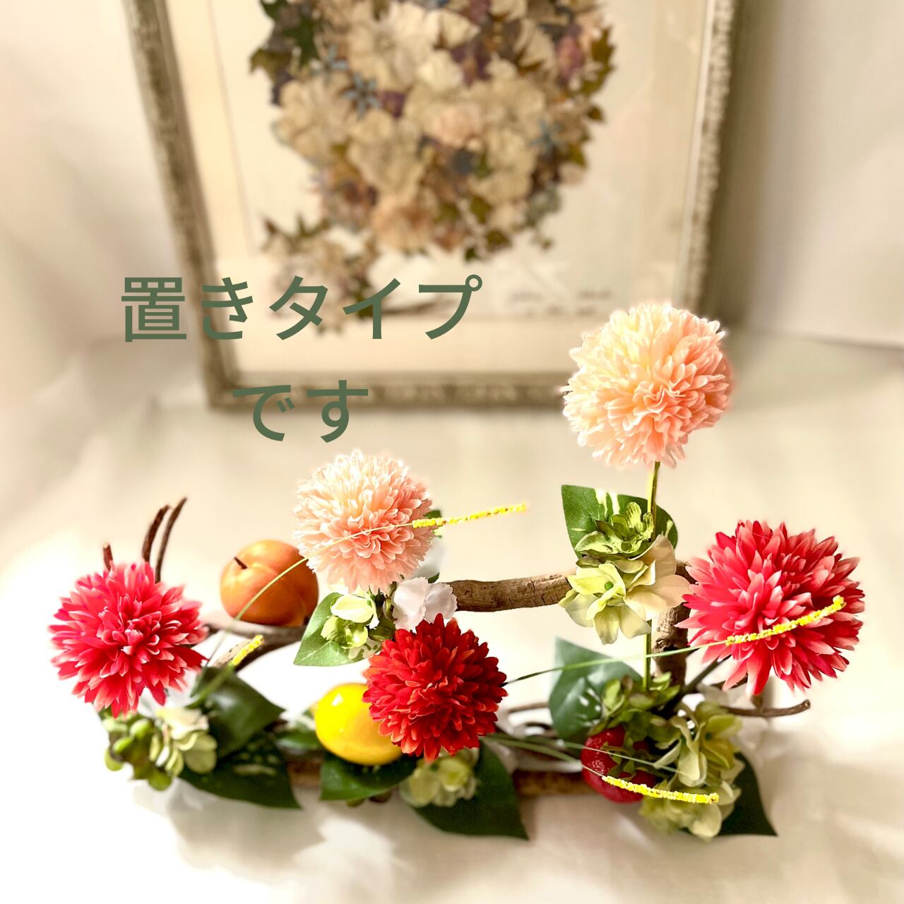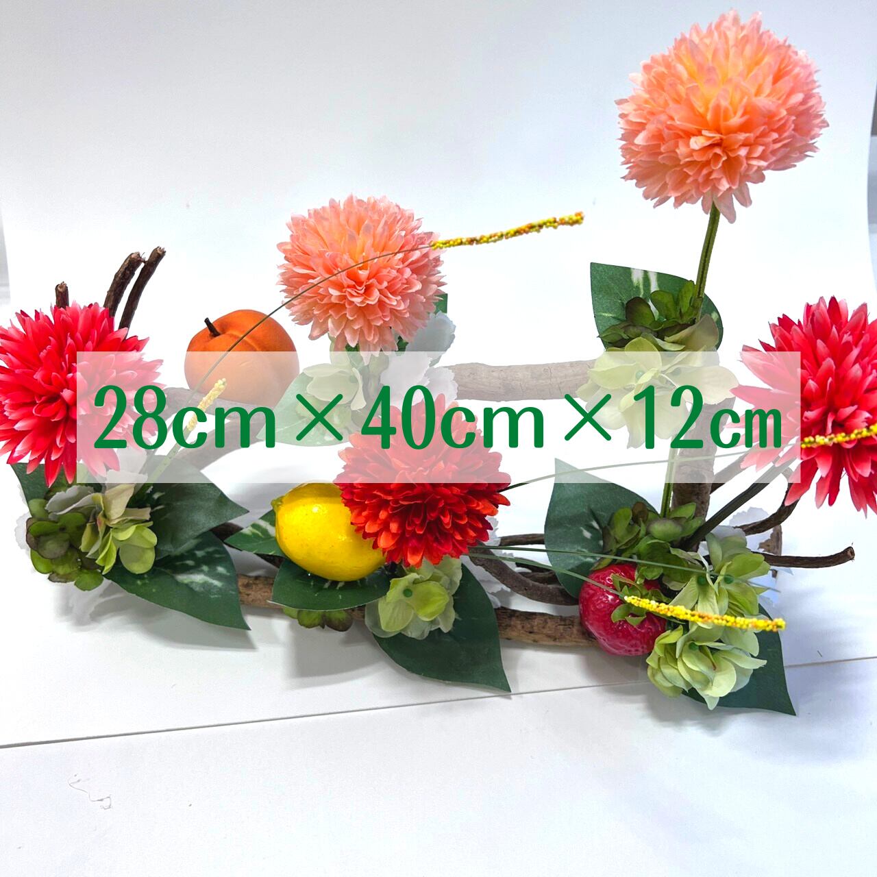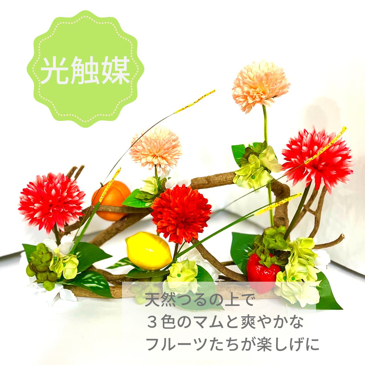 こちらの作品は、レッド•オレンジ系ピンクのピンポンマムと3種のフルーツが爽やかに彩られパワフルでもあり可愛さもありの作品です。