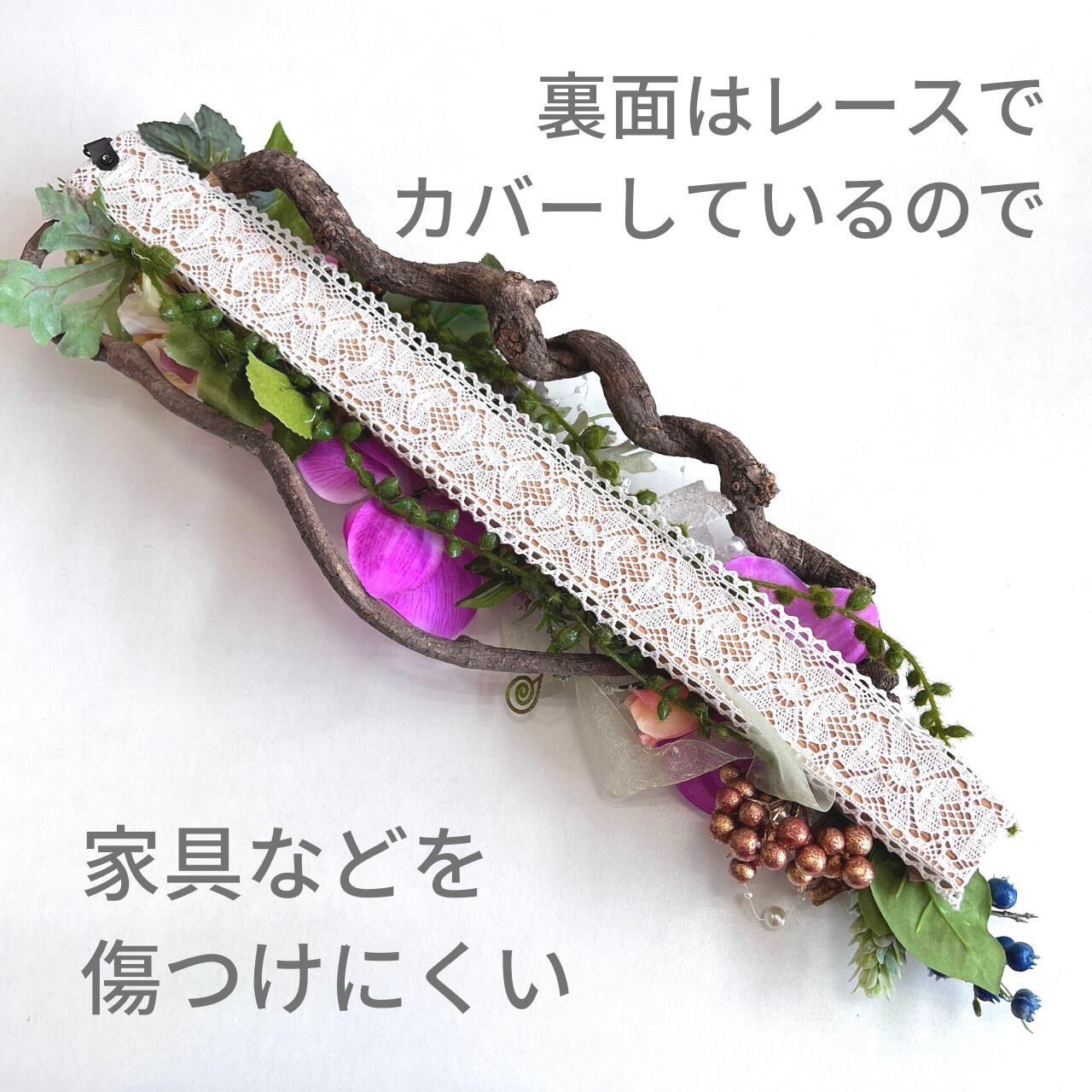 こちらの作品は、掛けて飾るタイプですが、低い場所などには置いて飾られても素敵かと思います。