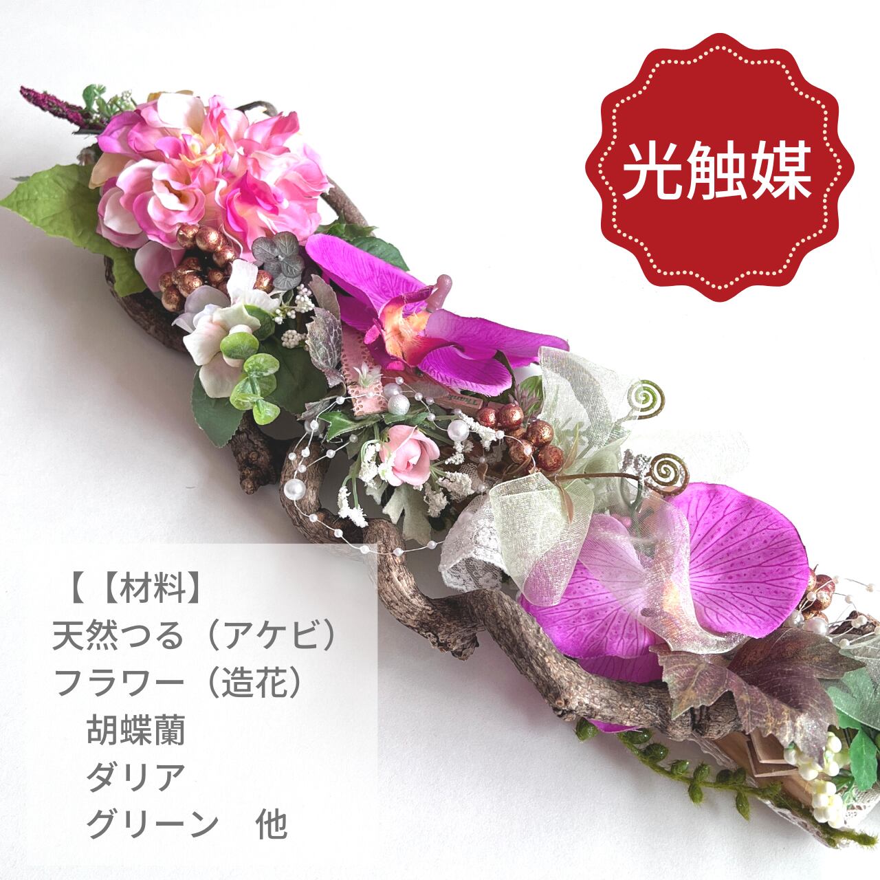 天然つると大輪の胡蝶蘭(造花)とダリア(造花)をアレンジした掛けタイプの作品です。