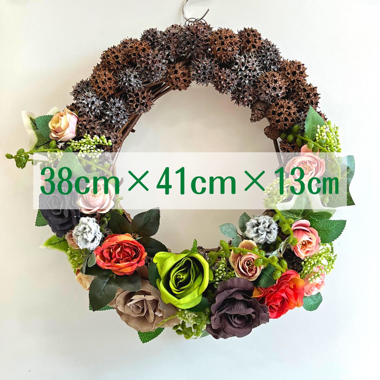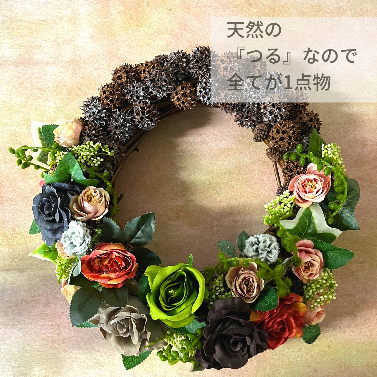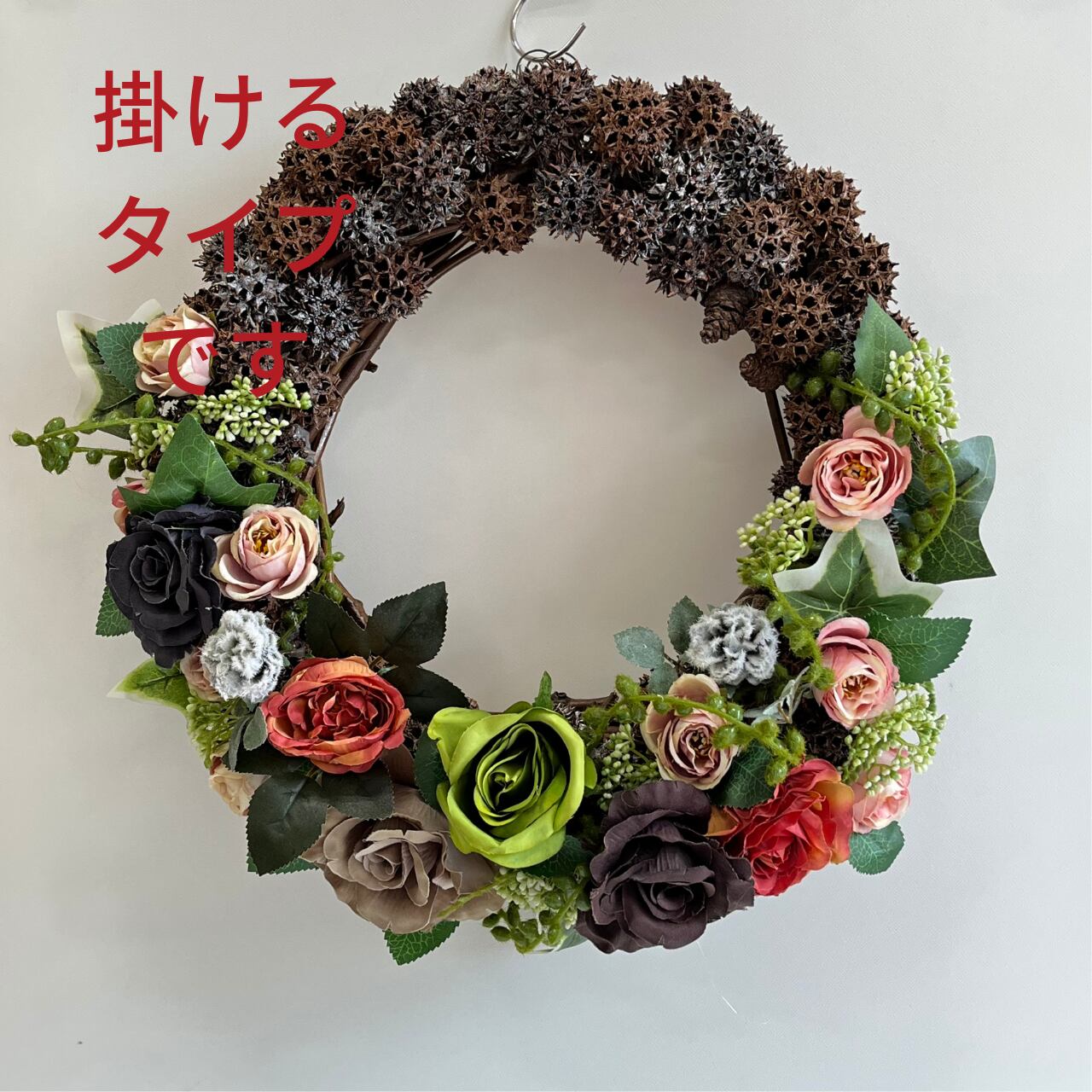 様々な大きさ、種類の違うバラで天然つるや木の実のゴツさを上手く調和し艶やかさをも感じさせるリースに仕上げております。