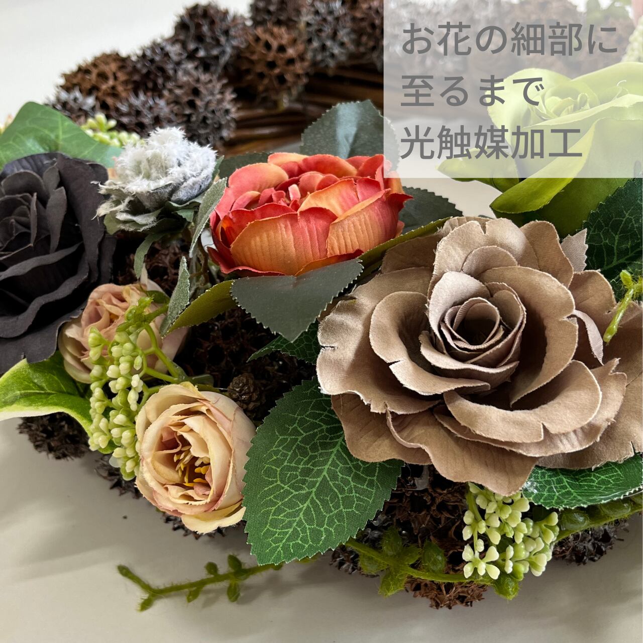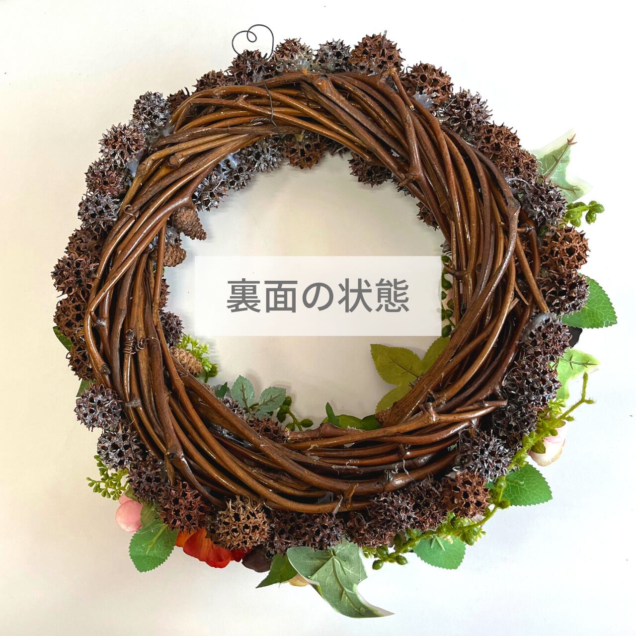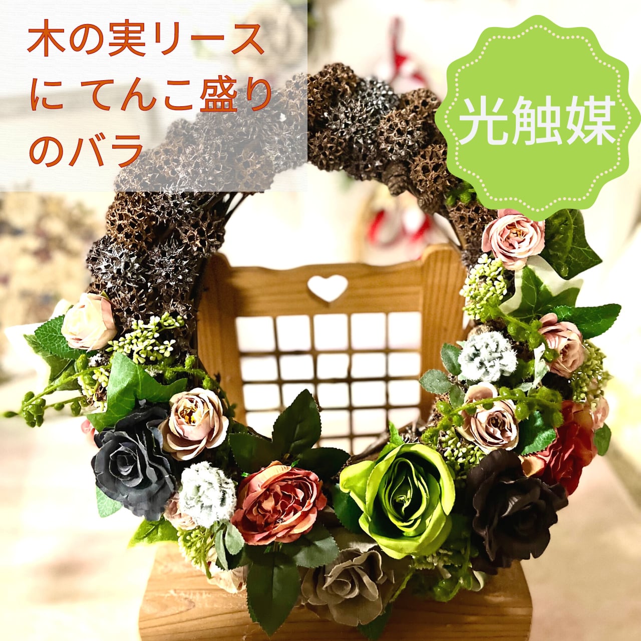 様々な大きさ、種類の違うバラで天然つるや木の実のゴツさを上手く調和し艶やかさをも感じさせるリースに仕上げております。