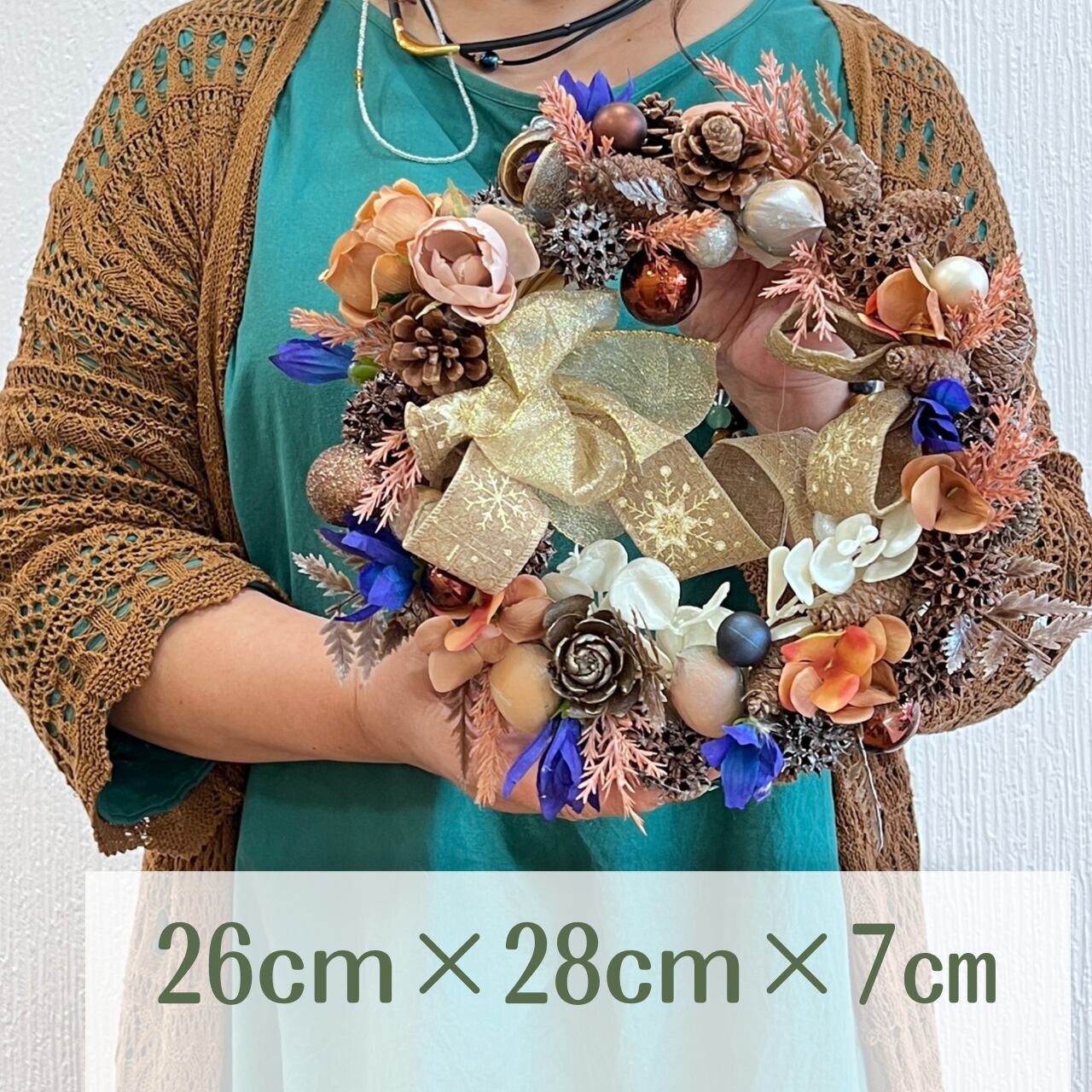 天然つると木の実を使う事で、渋い雰囲気になりますが濃いブルーのリンドウを細かく入れることでビビットに洗練されています。