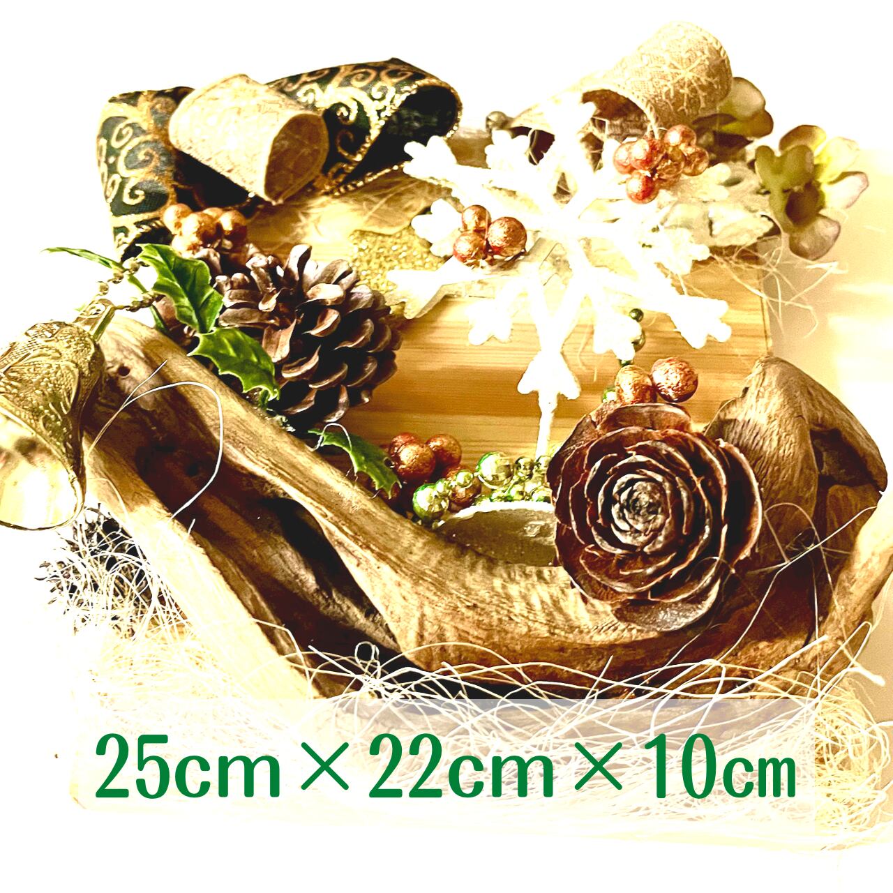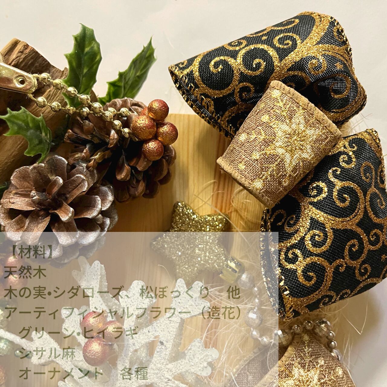 木の和調にキラキラのオーナメントをアレンジした一点物です。立体感のある雪の結晶オーナメントも素敵です。またアンティークリボンを付けたことでグッとムーディーになります。