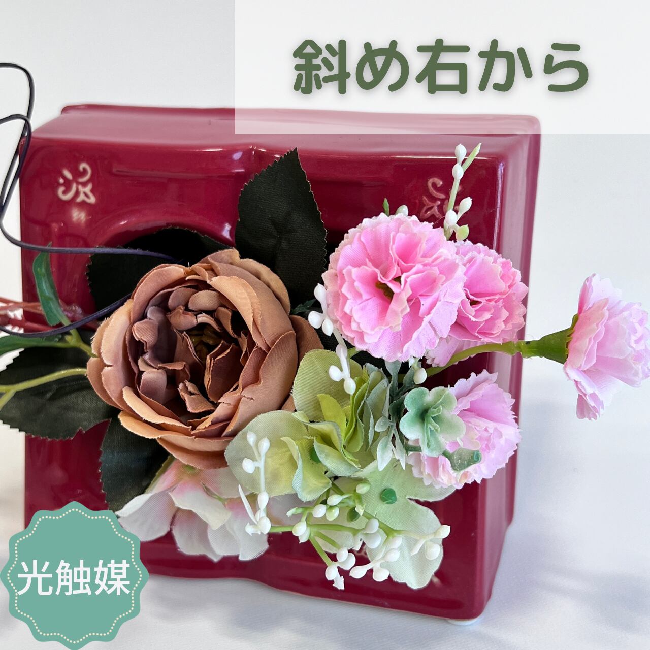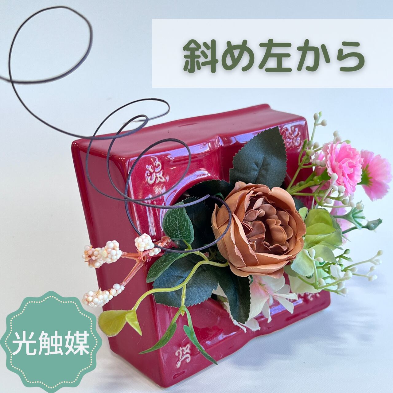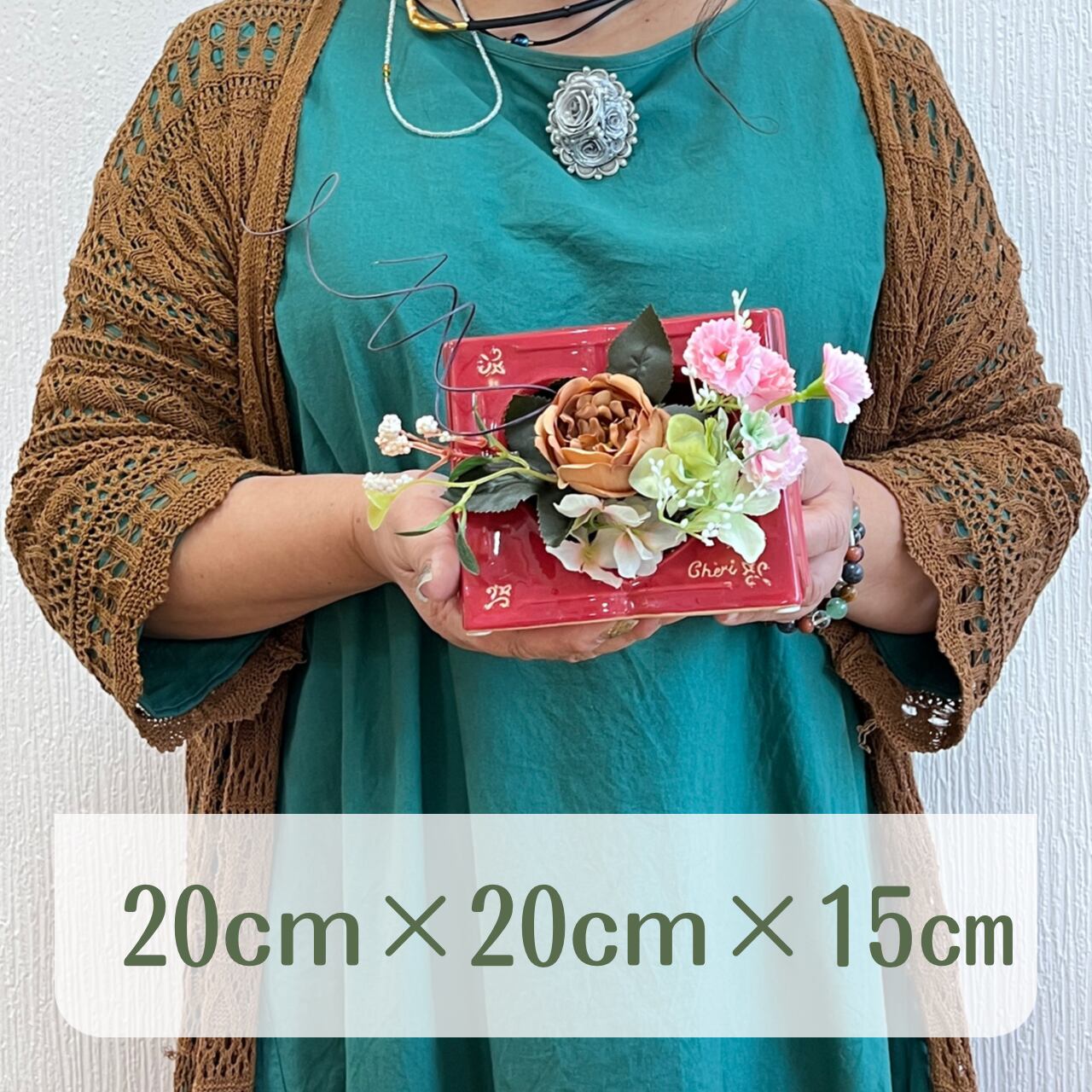 赤い陶器の花器が可愛くもあり安堵感も感じさせます。お花の挿し口がハートのため隠してしまわないようにアレンジしました。
