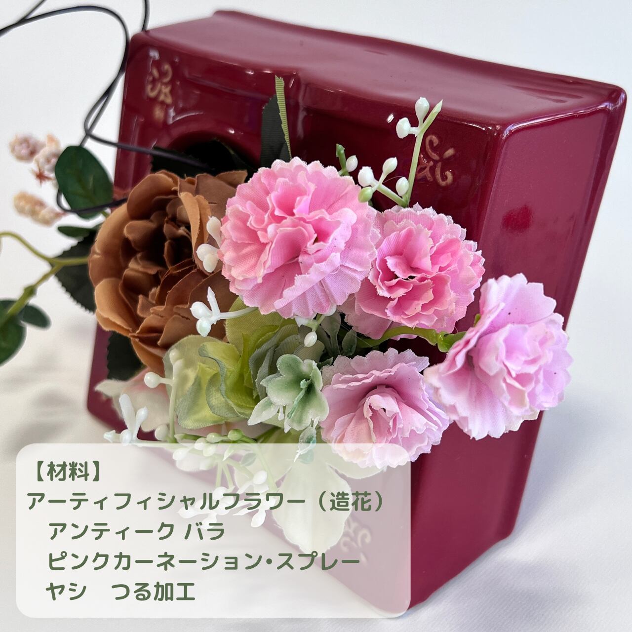 アンティークバラを一輪 使うことで可愛いカーネーションもグッと引き締まった感じになります。