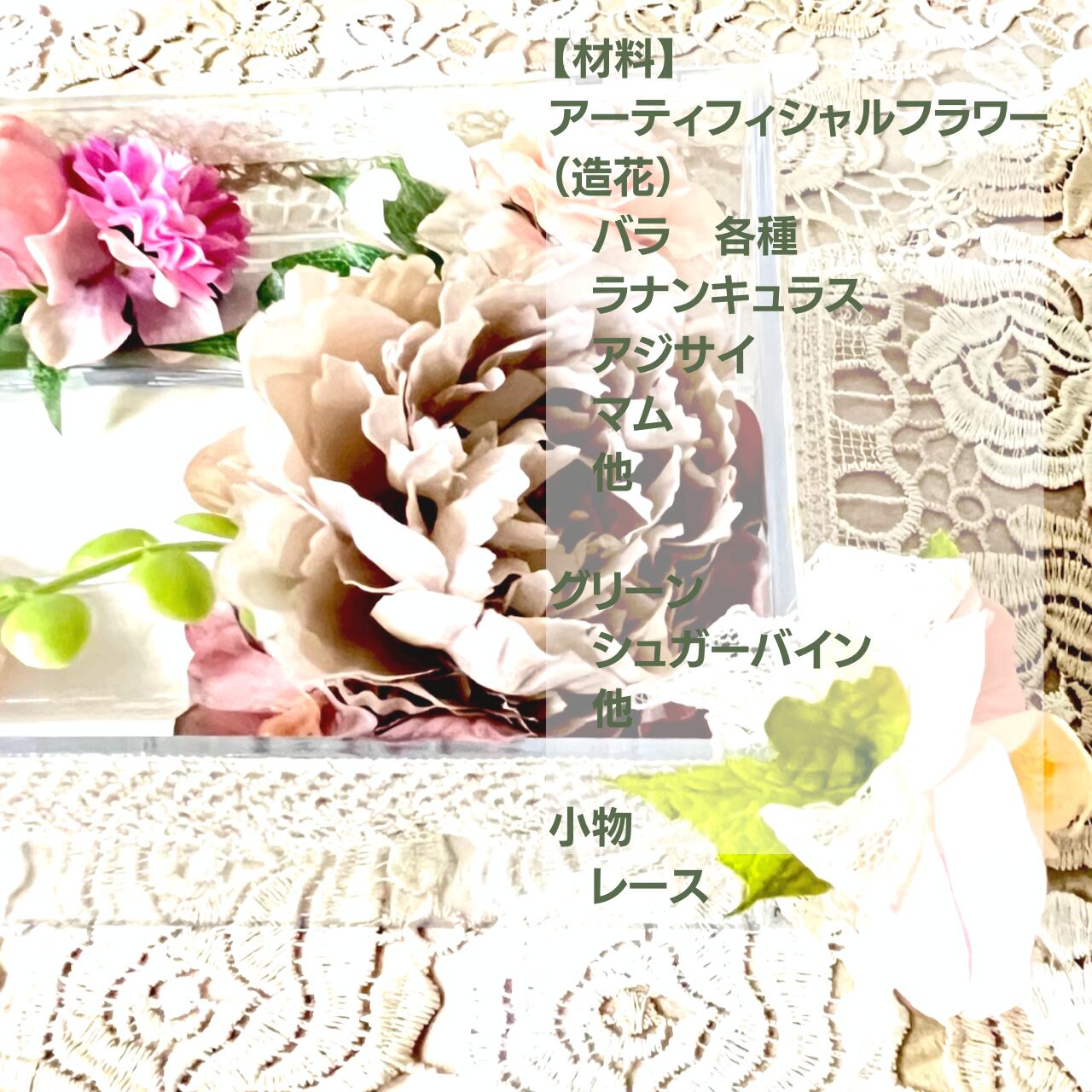 豪華なお色や可愛らしいお花を使いクリアーなケースを引き立たせています。グリーンも2、3色の濃淡使いをする事でグッと全体が引き締まります。