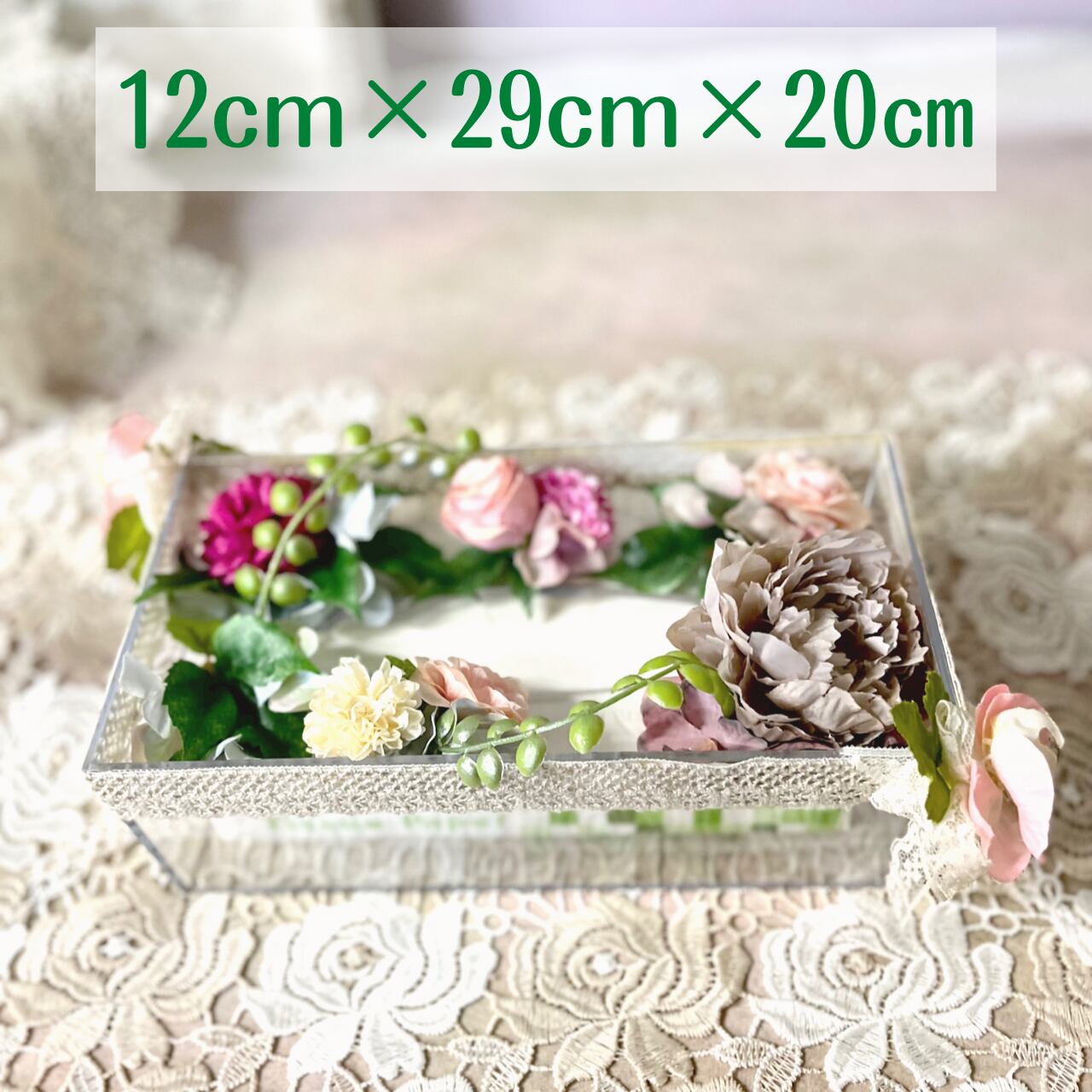 色々なアーティフィシャルフラワー(造花)のお花で飾られたゴージャス感たっぷりのティッシュケースです。