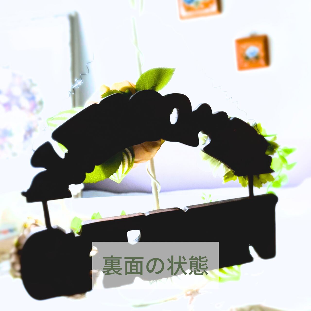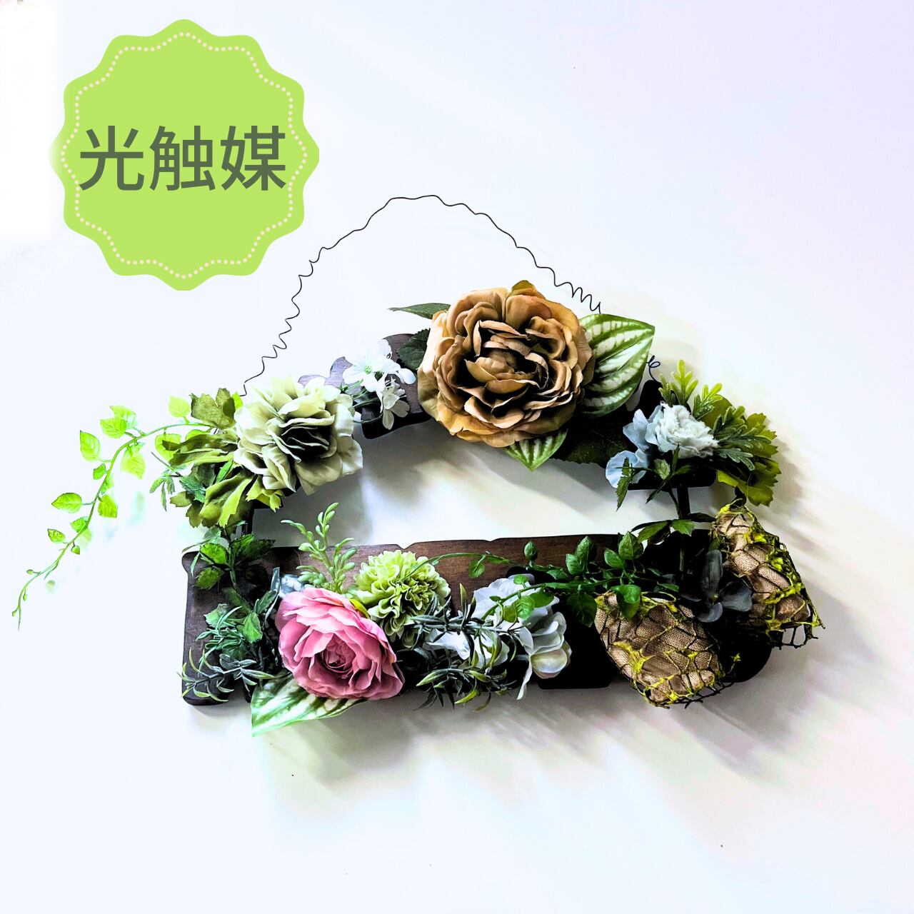 木製のプレートとアーティフィシャルフラワー(造花)をアレンジした掛けるタイプです。