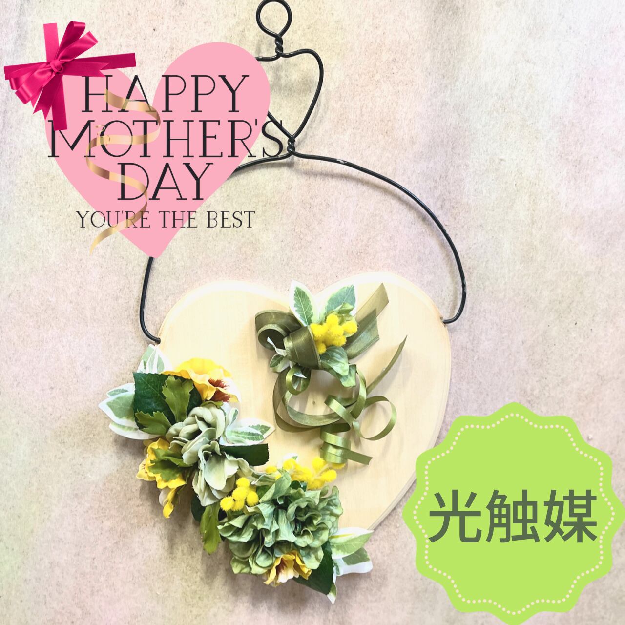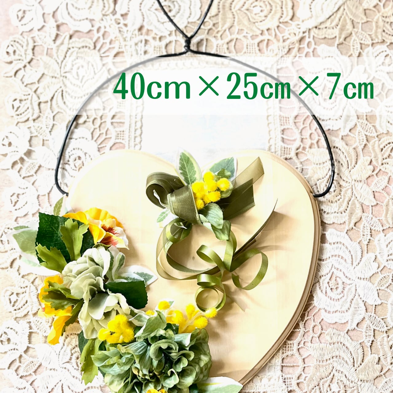 木製のハート型プレートとアーティフィシャルフラワー(造花)をアレンジした掛けるタイプです。