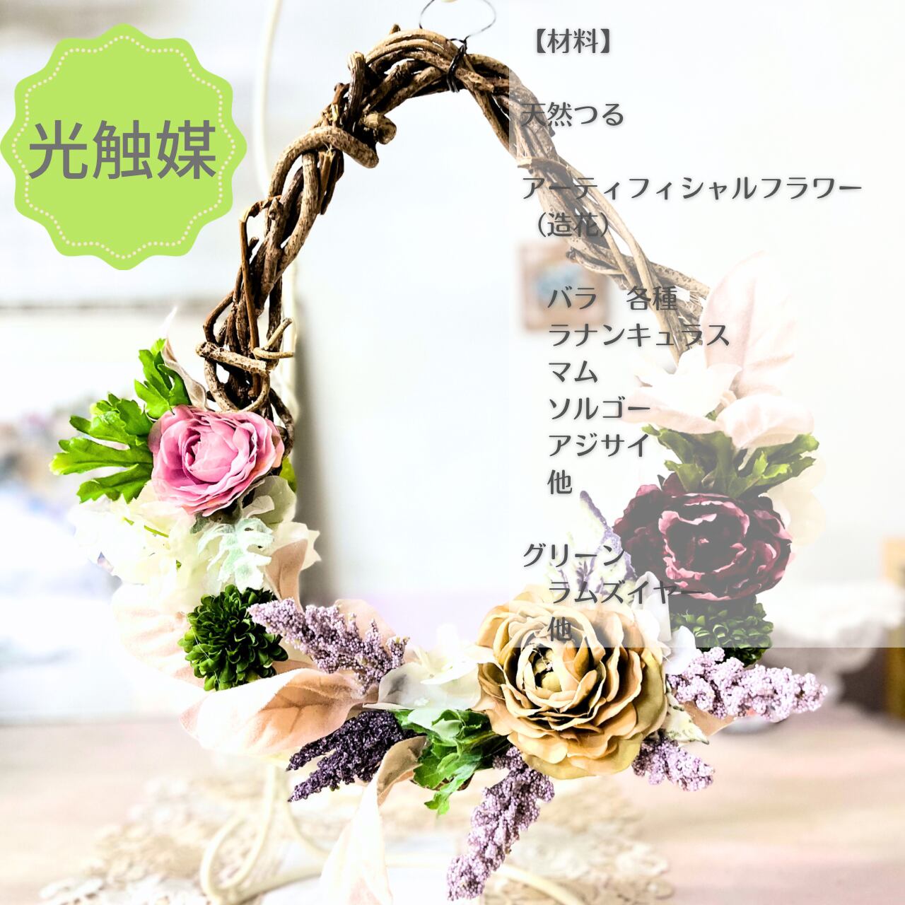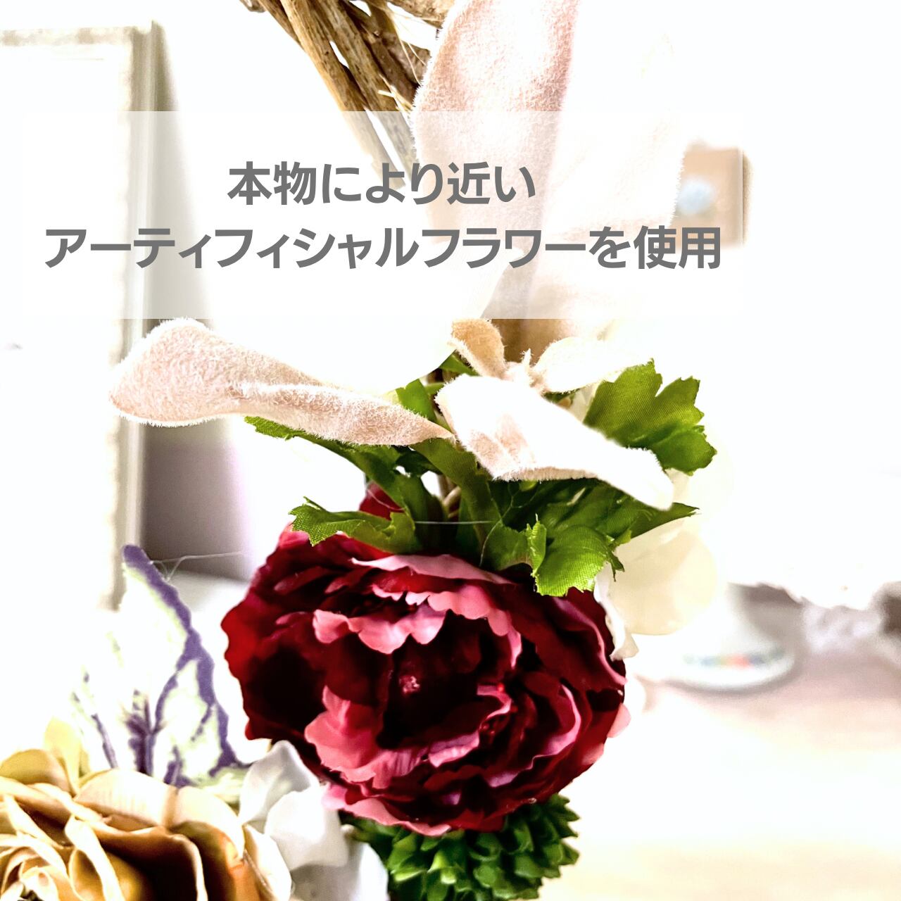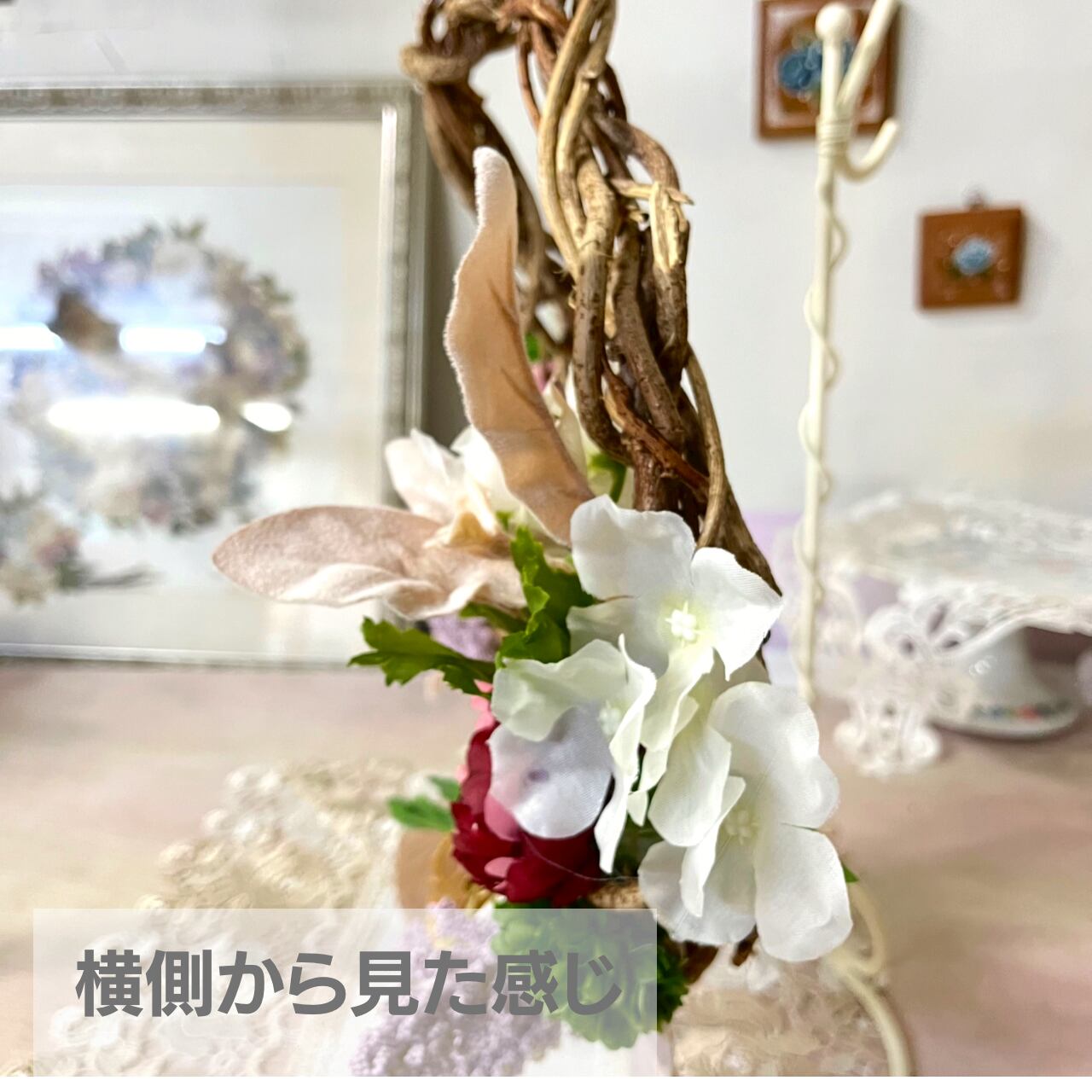 天然つるとアーティフィシャルフラワー(造花)をアレンジした掛けるタイプです。