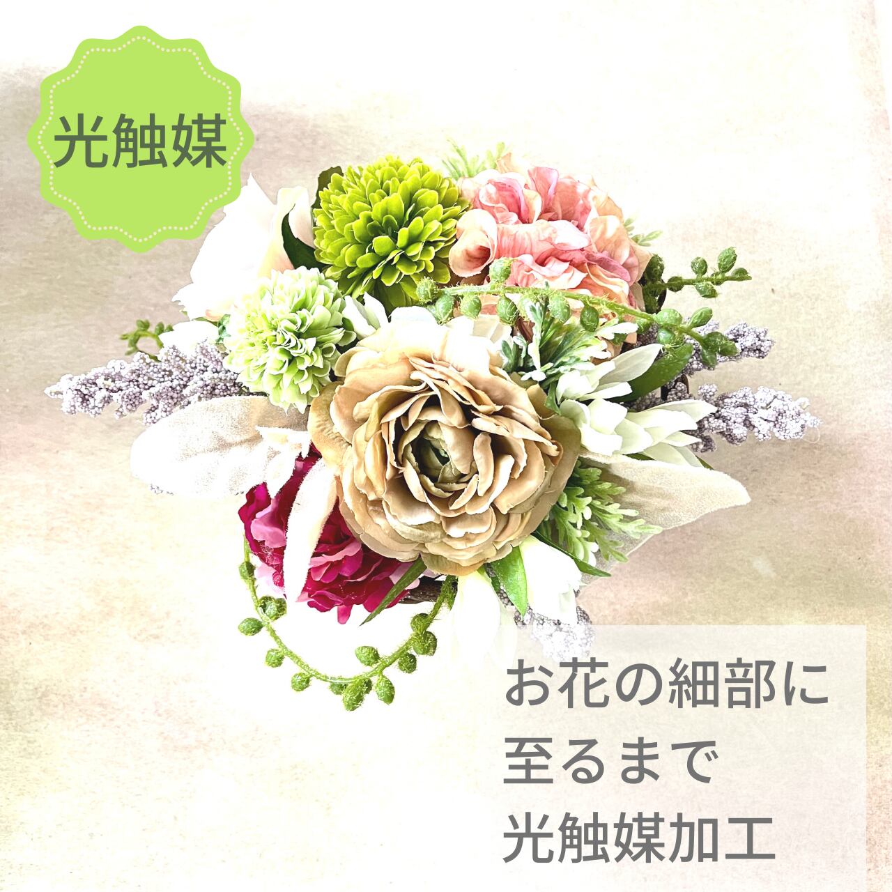 アーティフィシャルフラワーはもちろん花材,資材に至るまで【光触媒加工】を施しております。