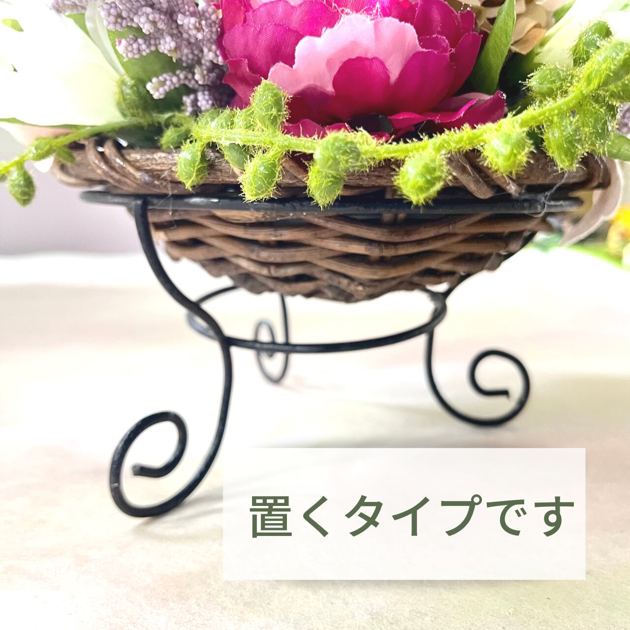 花入についても籐カゴがナチュラルな雰囲気を醸し出し、アイアンフレームが上品なアンティーク感を与えてくれます。