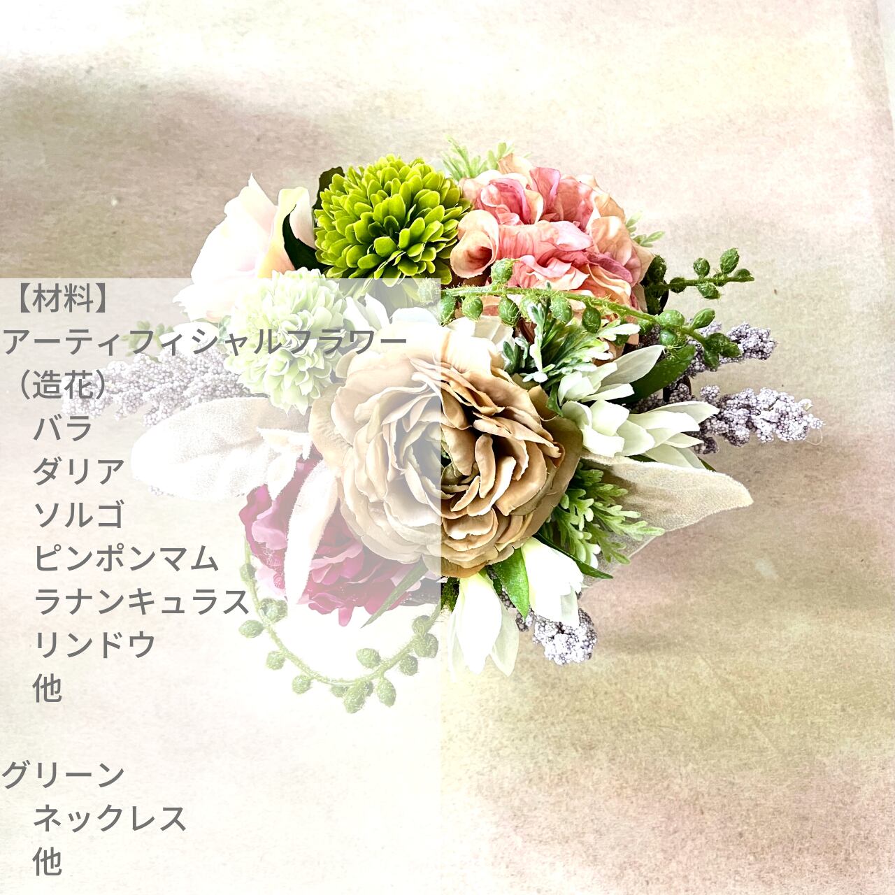 くすみカラーのバラ、2色のカラーを持つラナンキュラス、そしてグラデーション化されたピンクのダリアが中心にデザインしてあります。