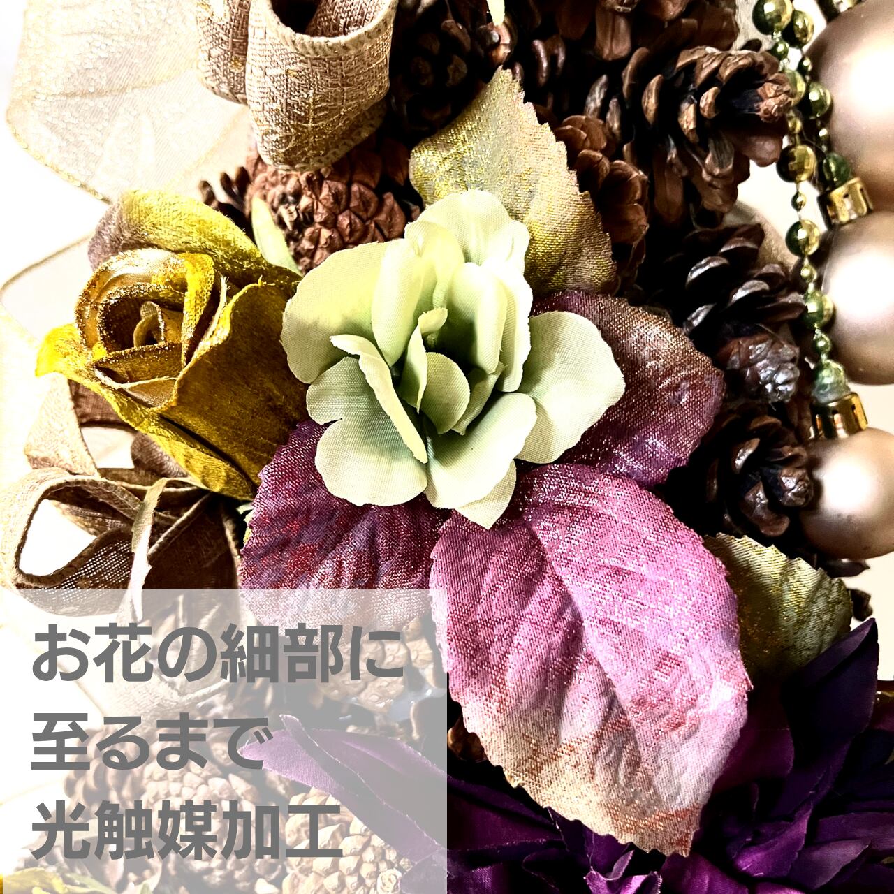松ぼっくりの落ち着いたブラウンカラーにゴージャスな大輪のダリアや大人色のリボンやオーナメントの飾り付けで豪華さを増しています。