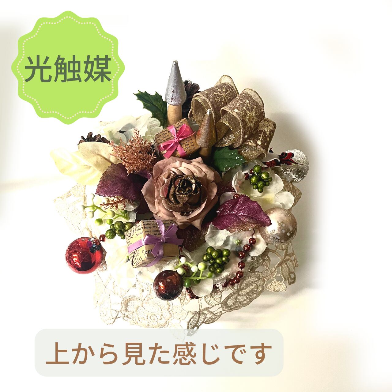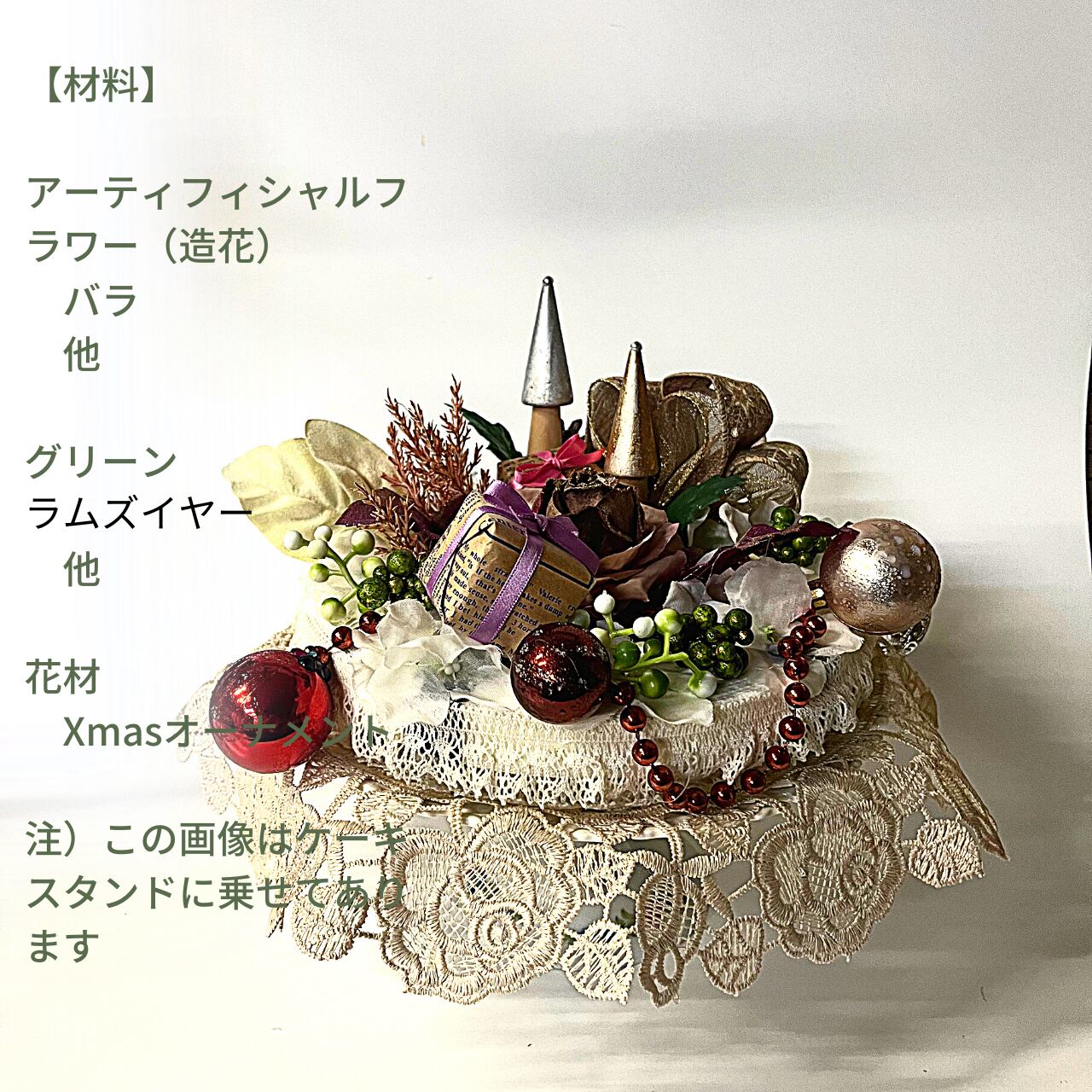 ホワイトカラーの円形上にアーティフィシャルフラワーやXmasオーナメントを盛り沢山に飾り付けています。