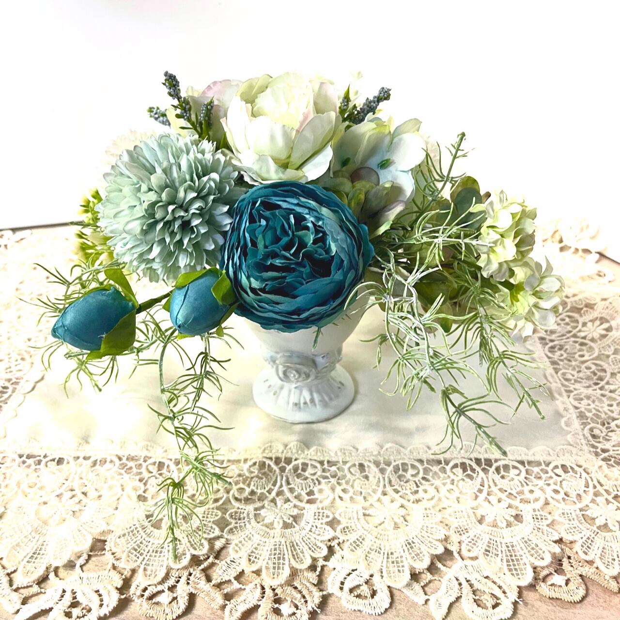 バラの花と葉が彫刻されたような小振りの花器にブルーカラーのお花で仕上げてみました。