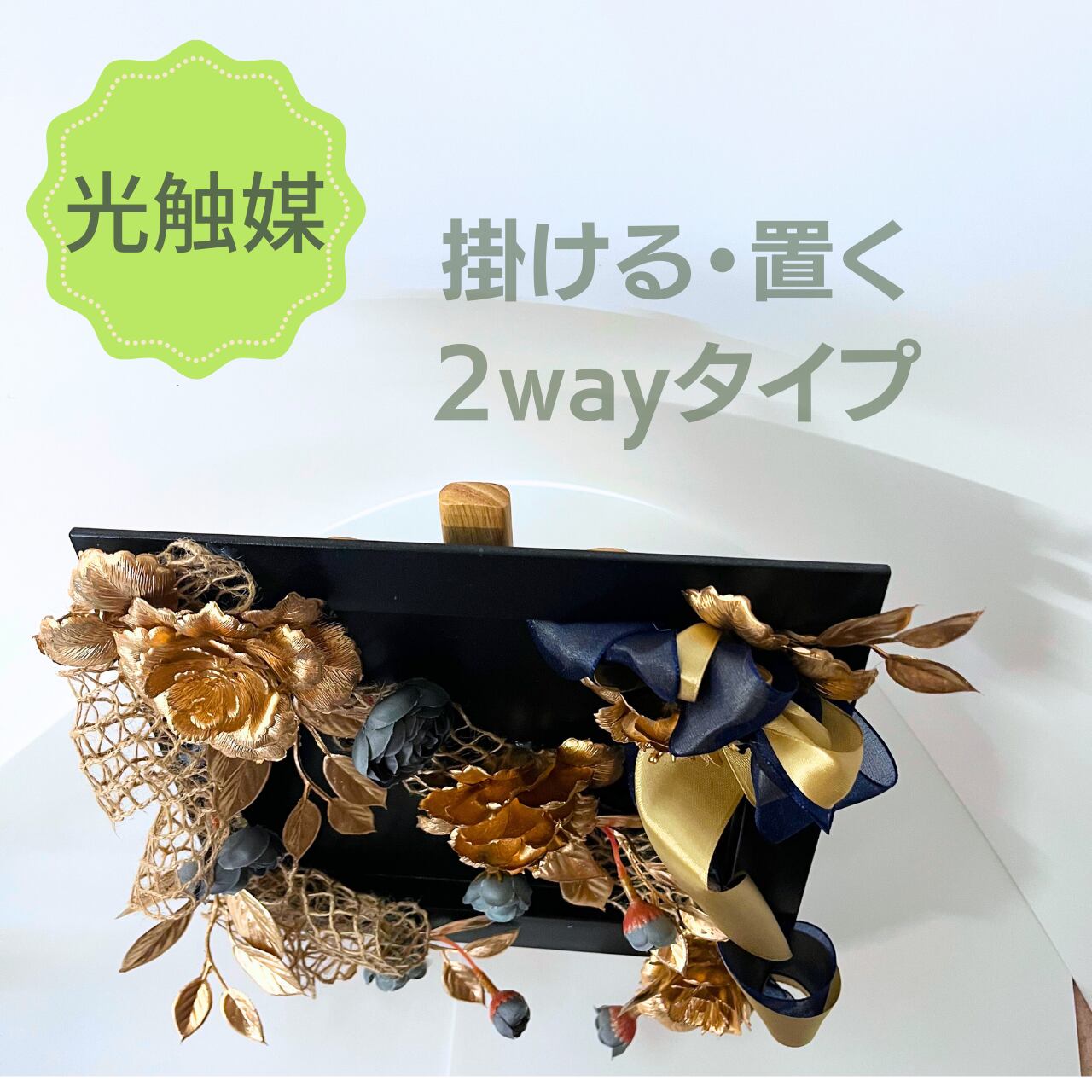 こちらはスクエア型プレートとアーティフィシャルフラワー(造花)をアレンジした掛けることも置くことも出来る2wayタイプです。