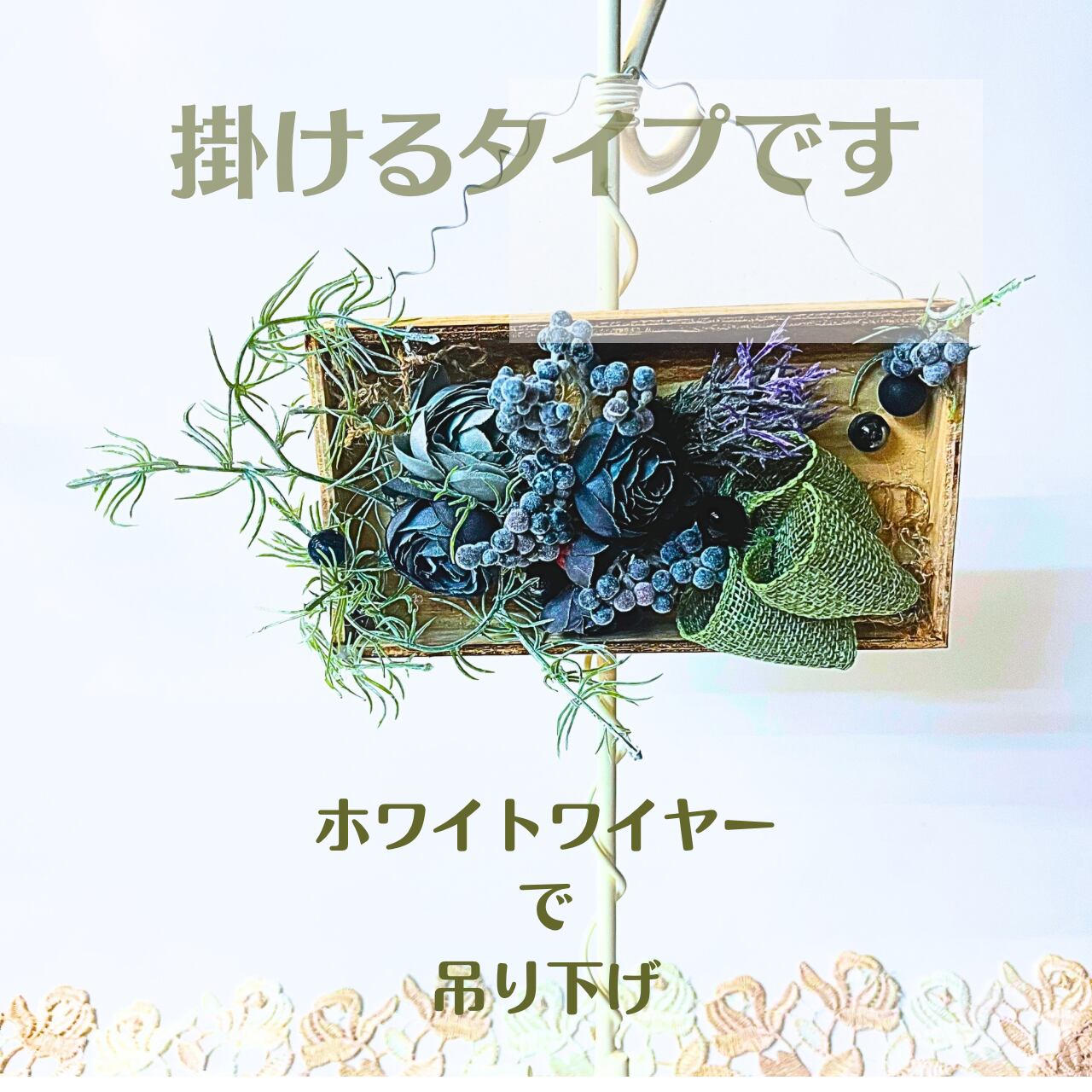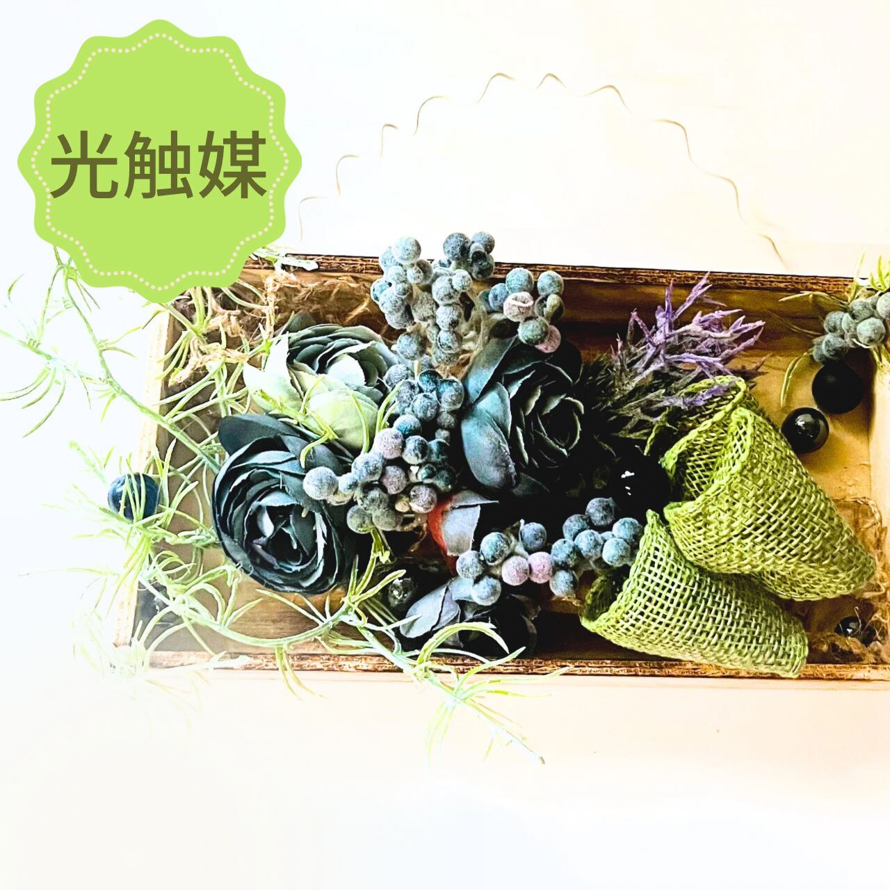 大切なお花を優しく木箱に詰めた雰囲気の作品です。天然石もアクセントにしてあります。