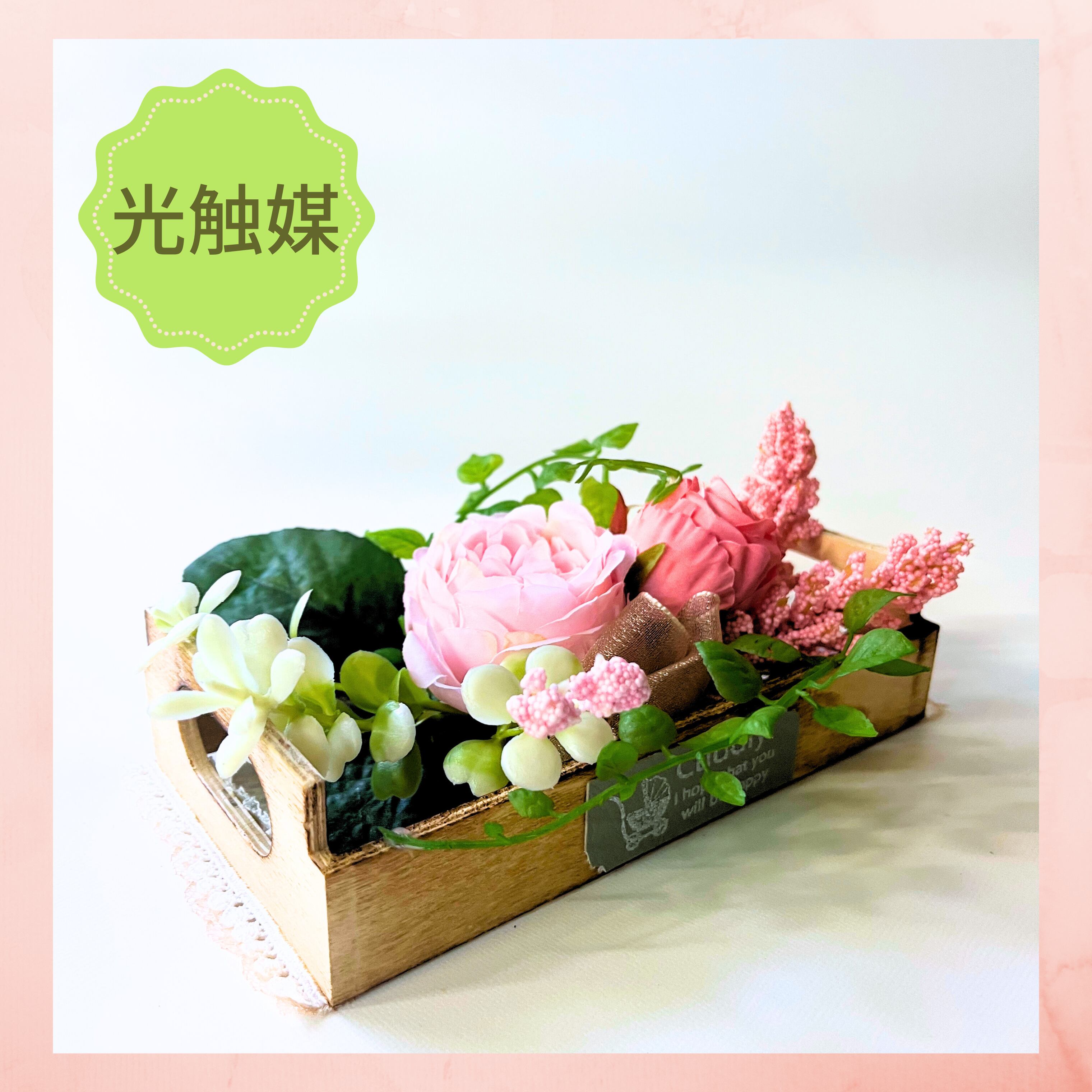 こちらの作品は木箱を器にピンク系のお色のお花をアレンジしました。