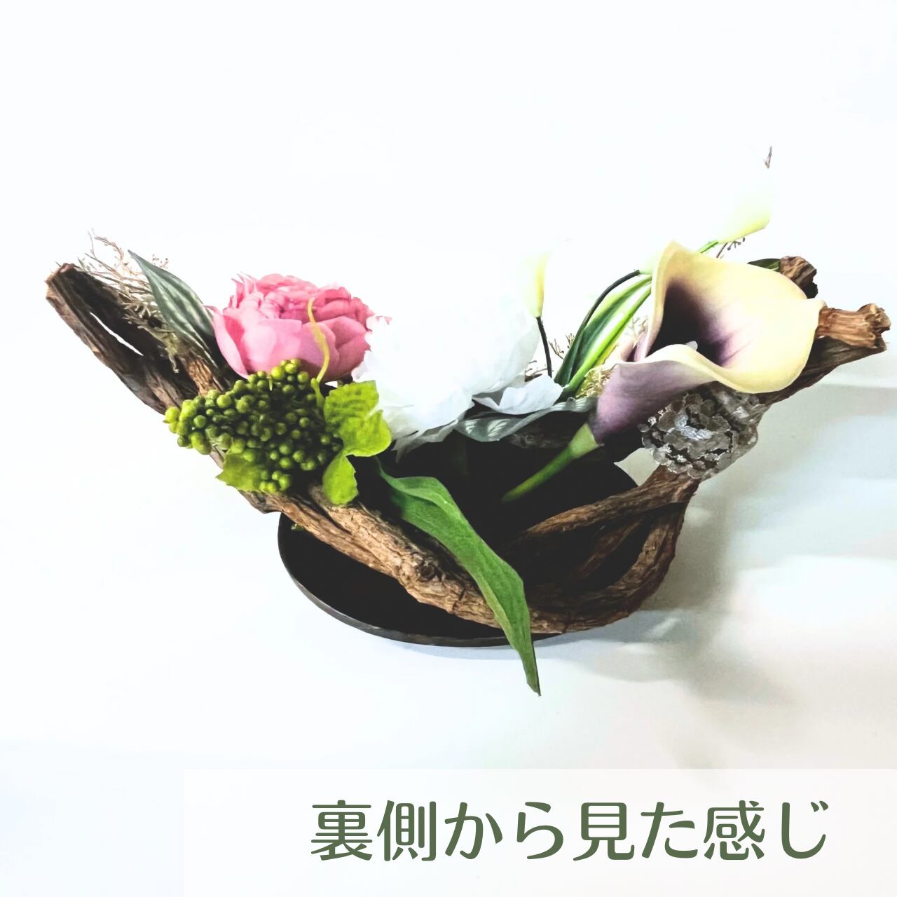 こちらの作品は巻き込んだ天然つるを組み込み花器にしアレンジを施したものです。