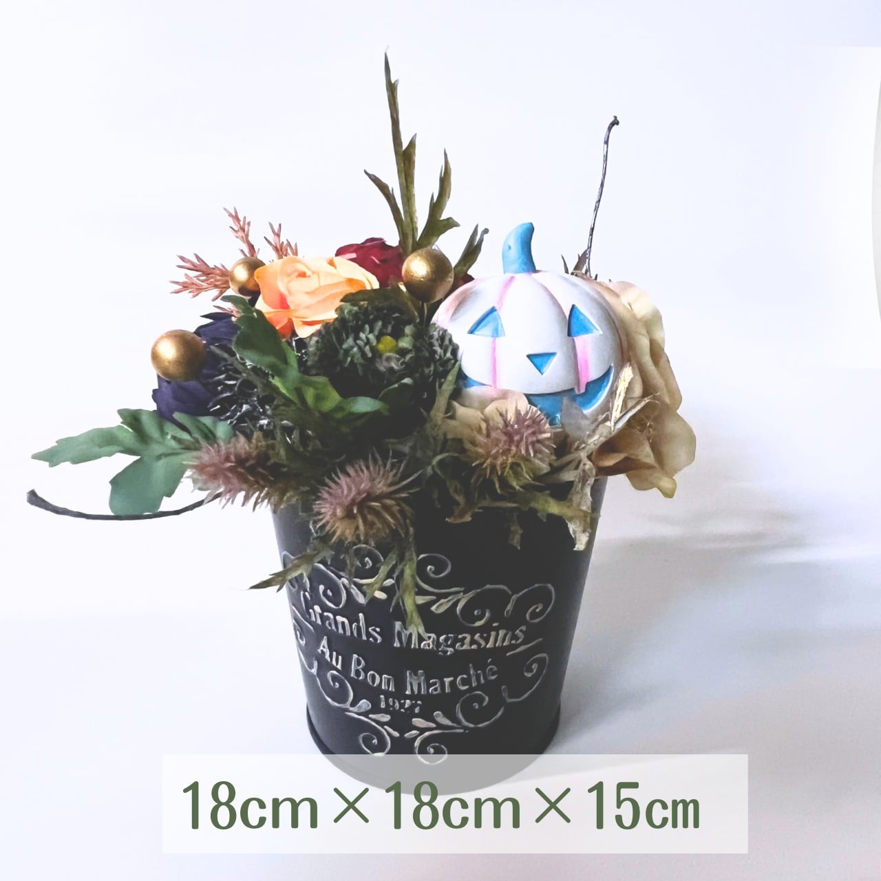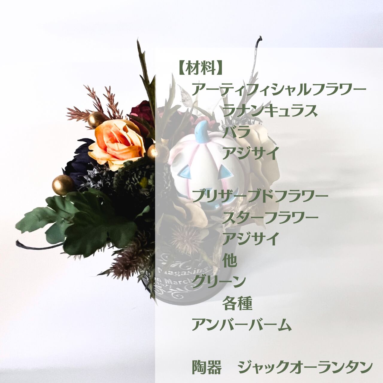 どっしりとした陶器のジャックオーランタンを数々の花やグリーンが包み込んでいる様がキュンなハロウィンに仕上がっています。