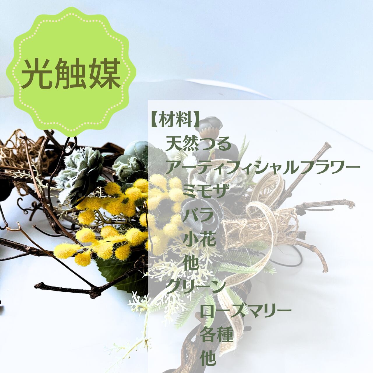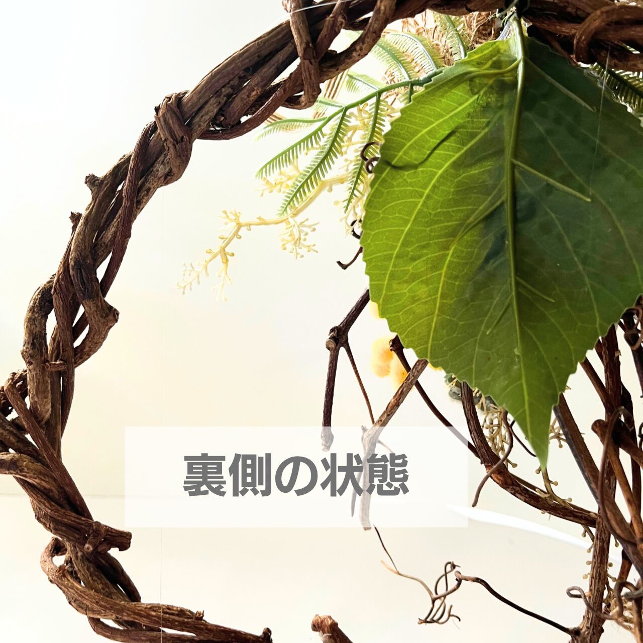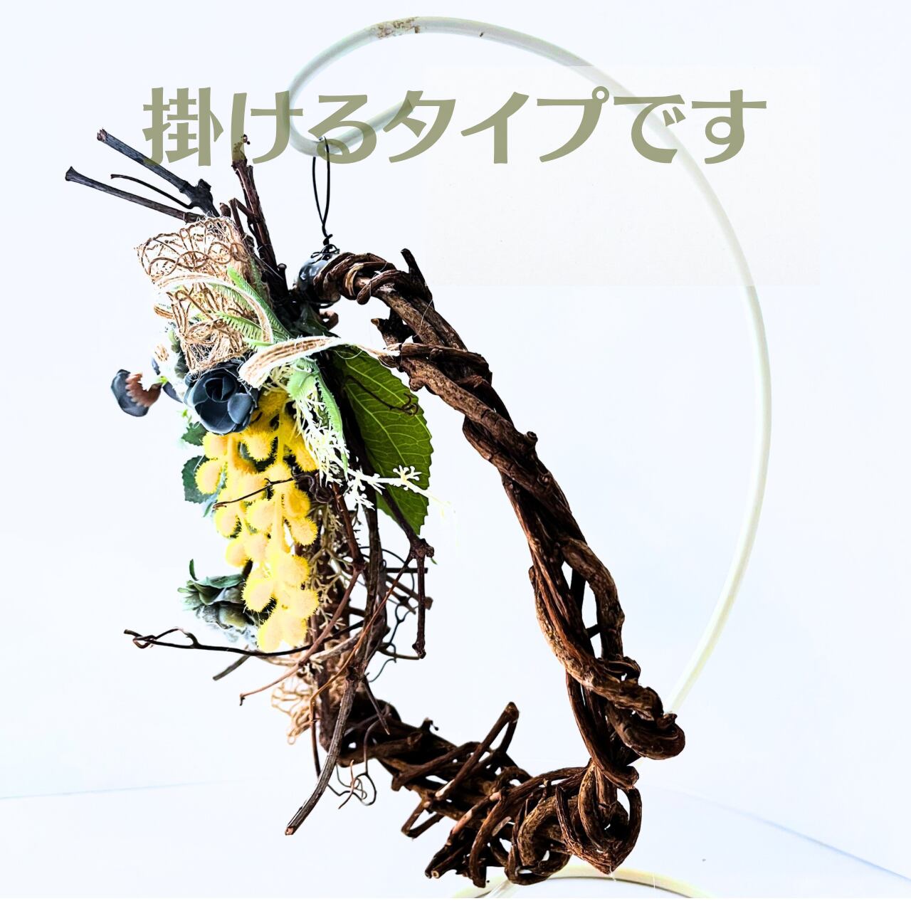 ナチュラルな天然つるとミモザのイエロー色が素敵な雰囲気を醸し出しています。