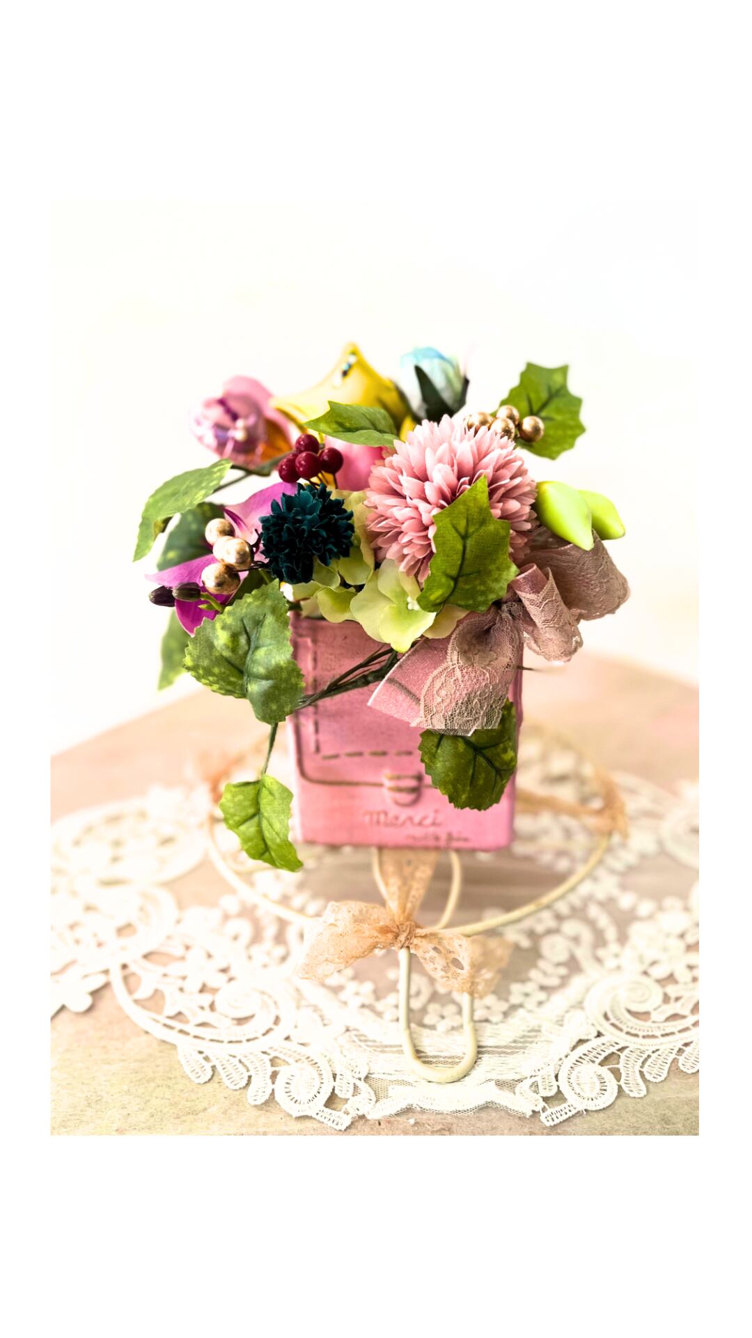 こちらの作品は優しいピンク色のランドセル型花器に華やかなアーティフィシャルフラワー(造花)をアレンジしてみました。