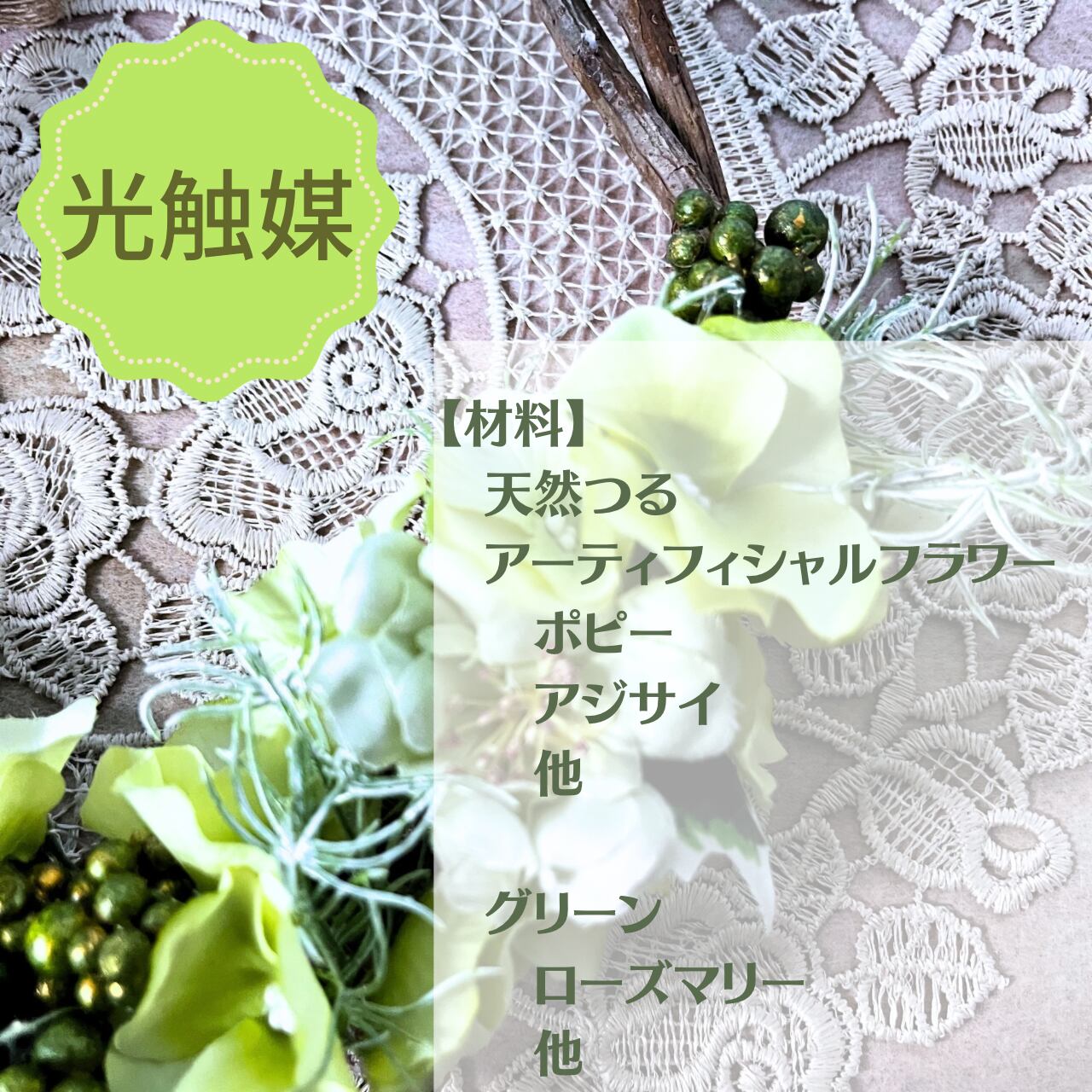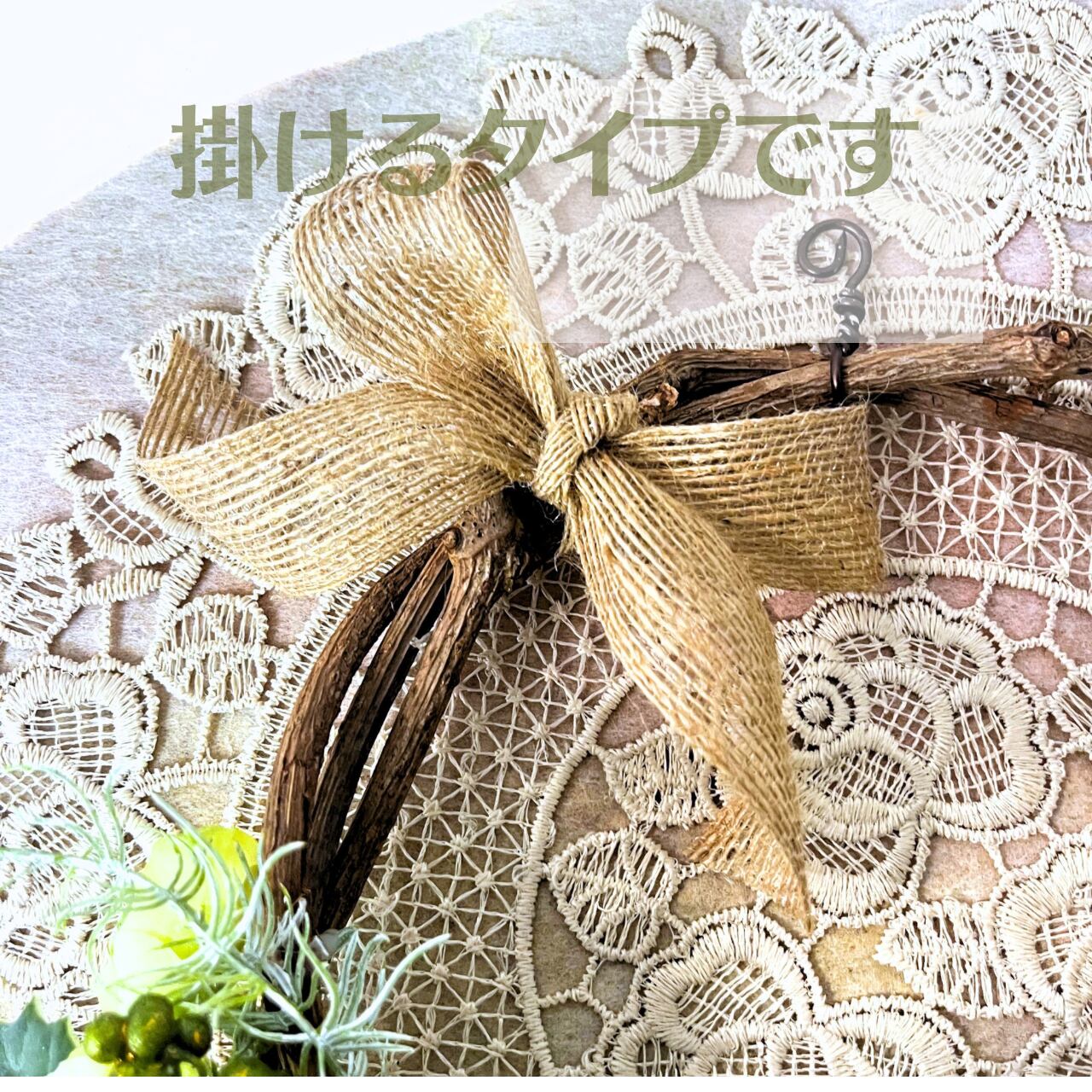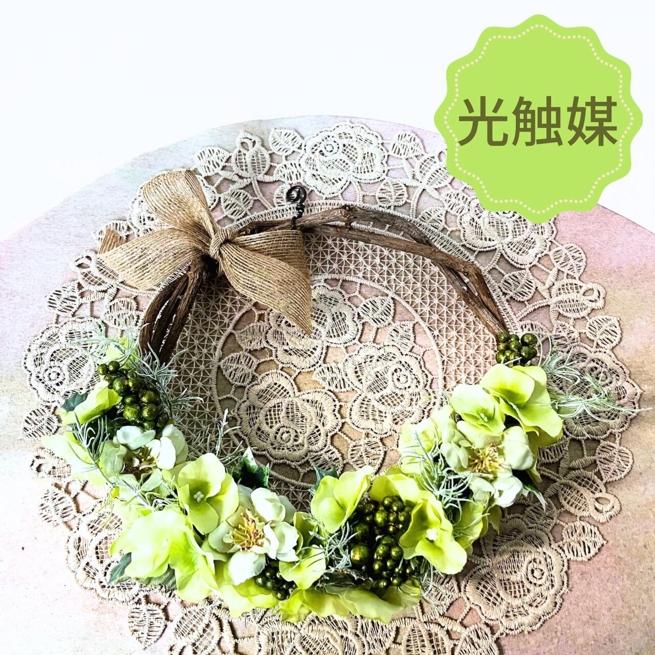 こちらは天然つるリースに2種類のグリーン色のお花をアレンジしてみました。