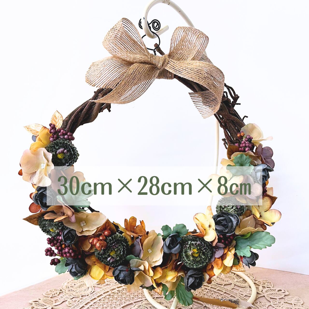落ち着いた色合いの花材を豊富に使いボリュームあるリースに仕上がています。