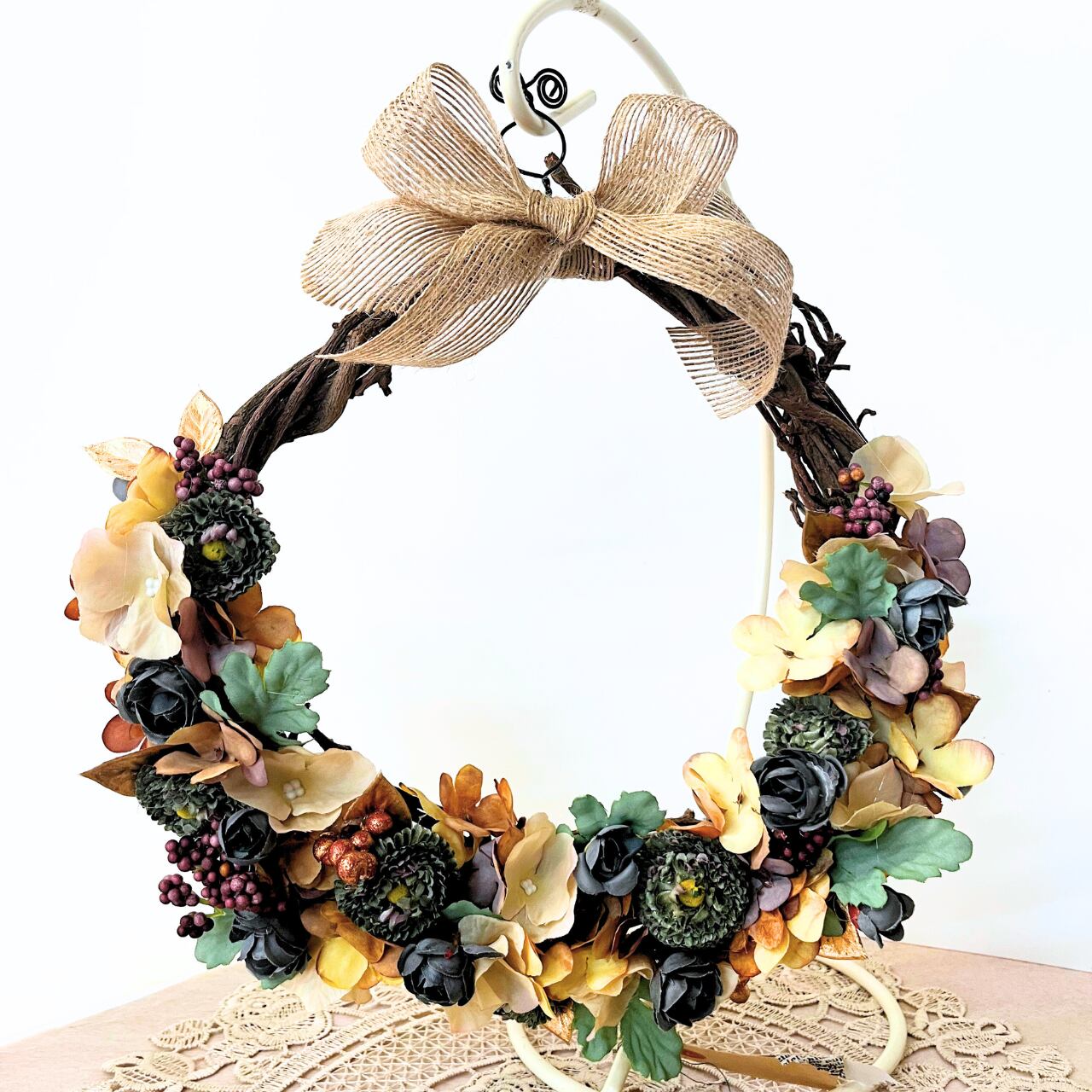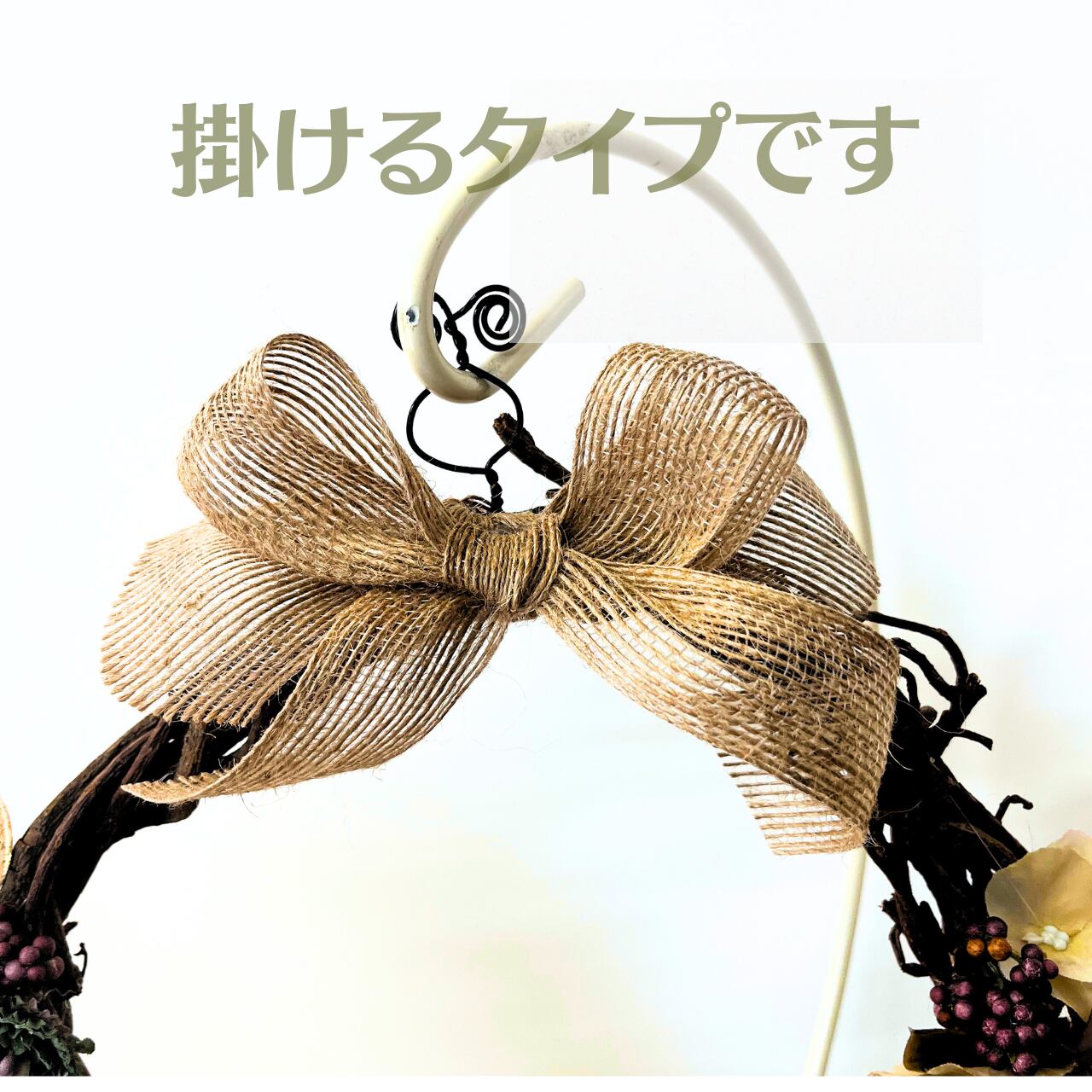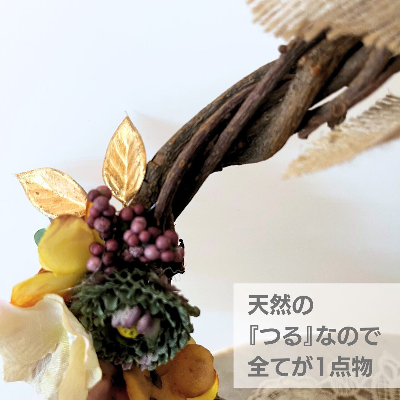 こちらは天然つるリースに何種類ものお花と実をアレンジしてみました。