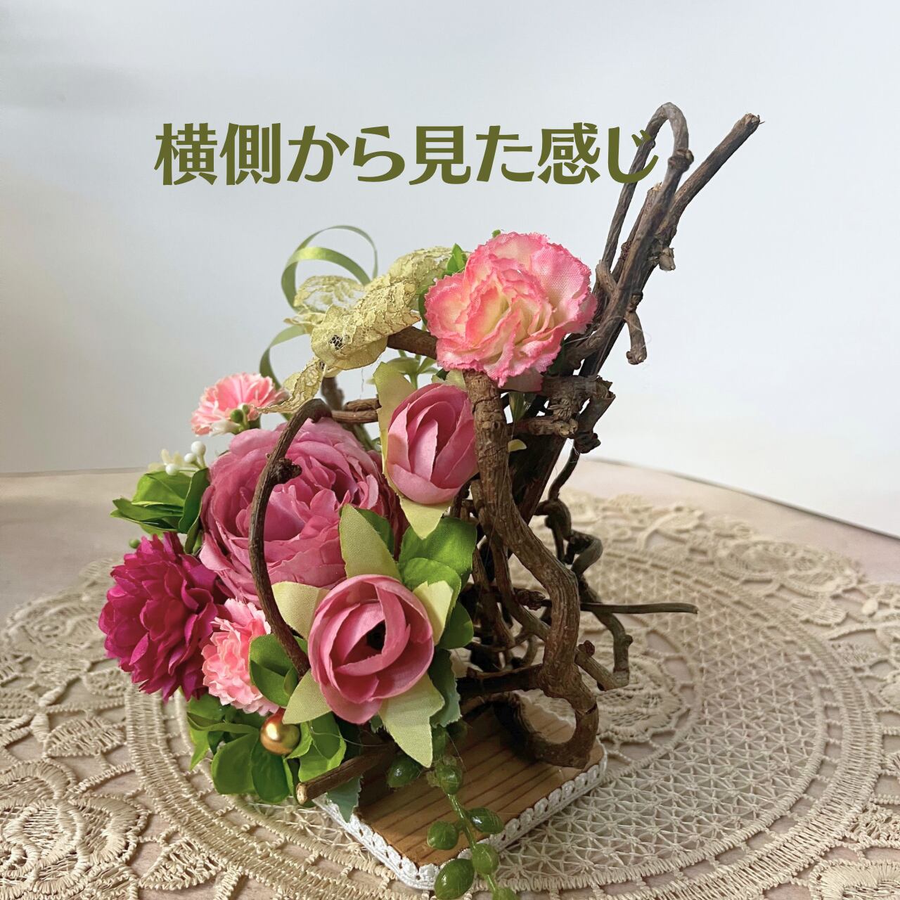 こちらの作品は天然つるにアーティフィシャルフラワー(造花)をたっぷりとアレンジした作品です。